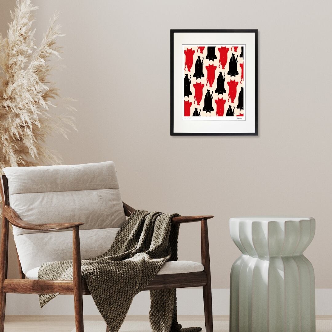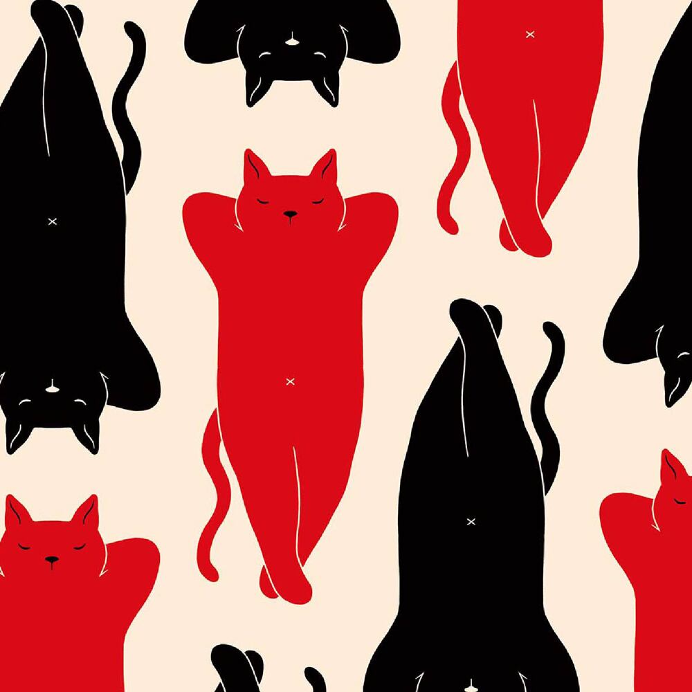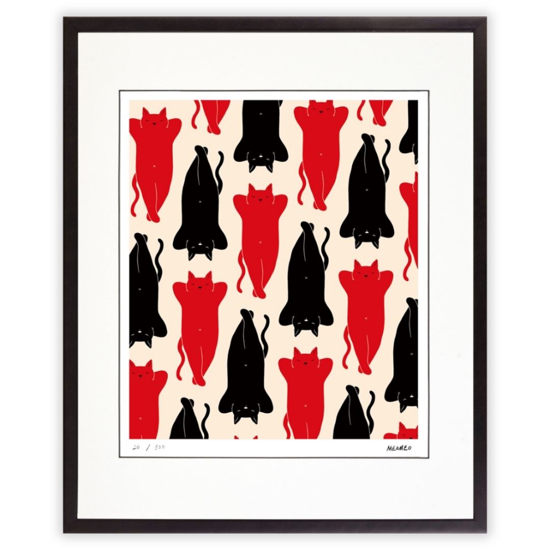 画面いっぱいに赤と黒の猫たちが同じポーズで並び、仰向けになって眠る姿が規則的に配置されています。その整然とした構図はパターンのような美しさを持ちながらも、どこかユーモラスで心を和ませます。猫のしなやかな体のラインや気ままな寝姿は、日常の一コマを切り取ったようでありながら、抽象的な模様のような視覚的効果も生み出しています。背景の余白が猫のフォルムを際立たせ、モノトーンと赤の大胆な色使いが空間に強い印象を与える、シンプルでモダンな魅力のある作品です。
