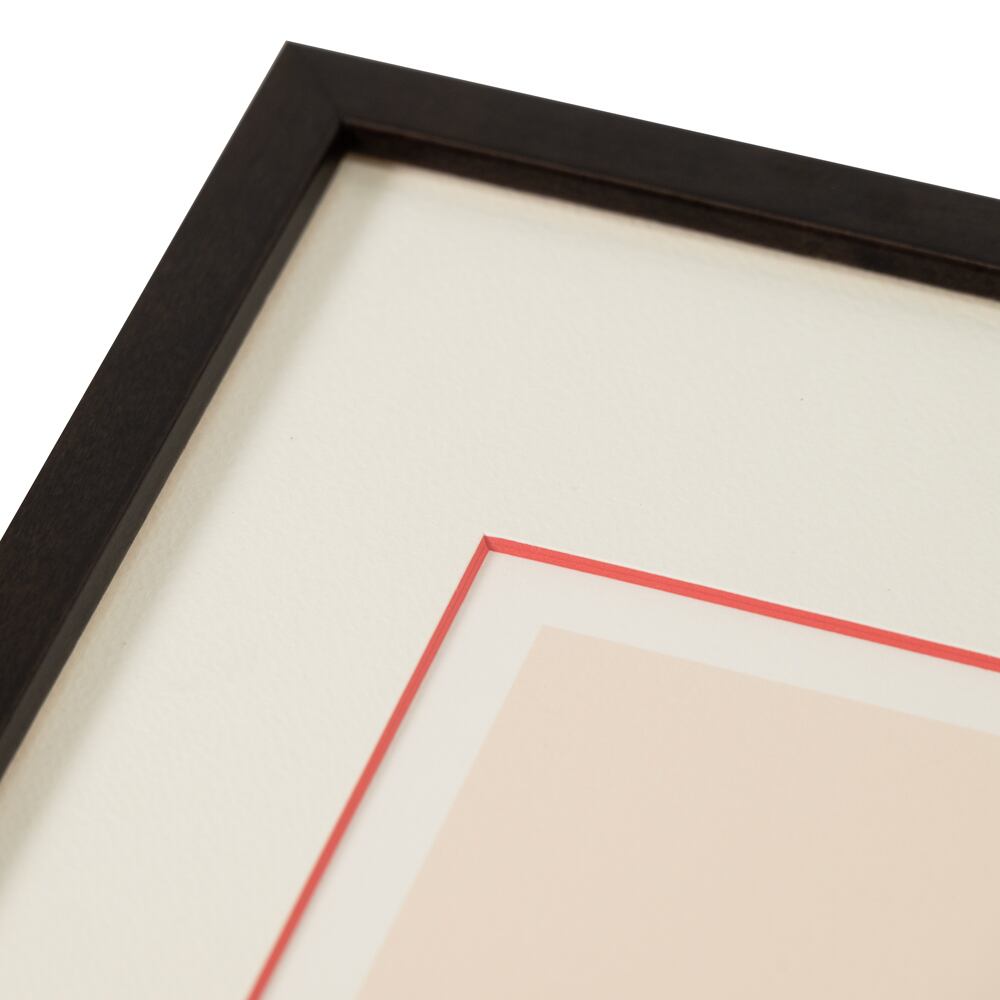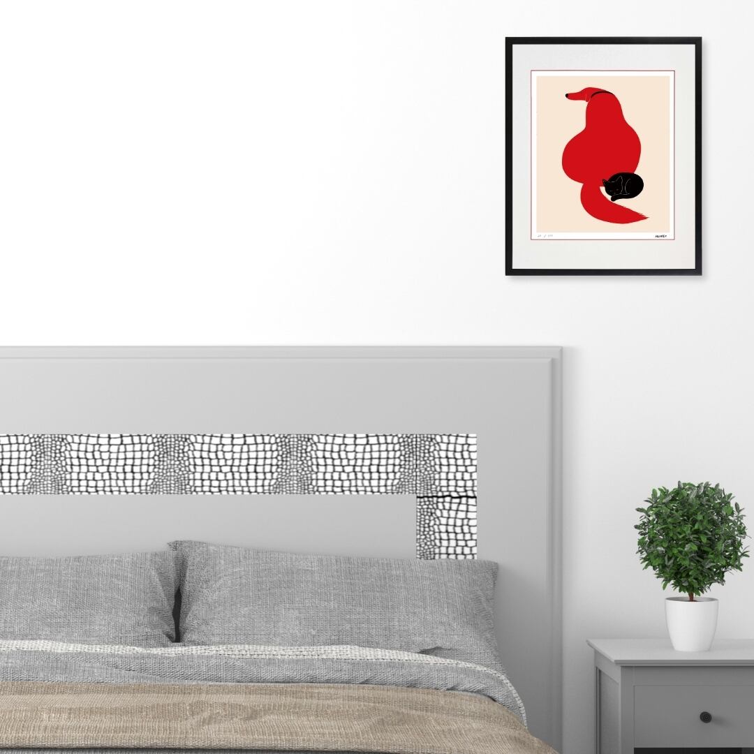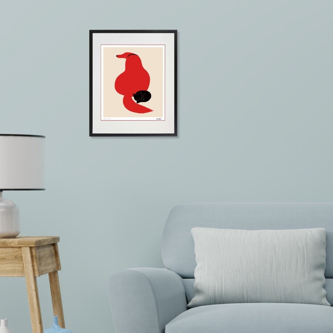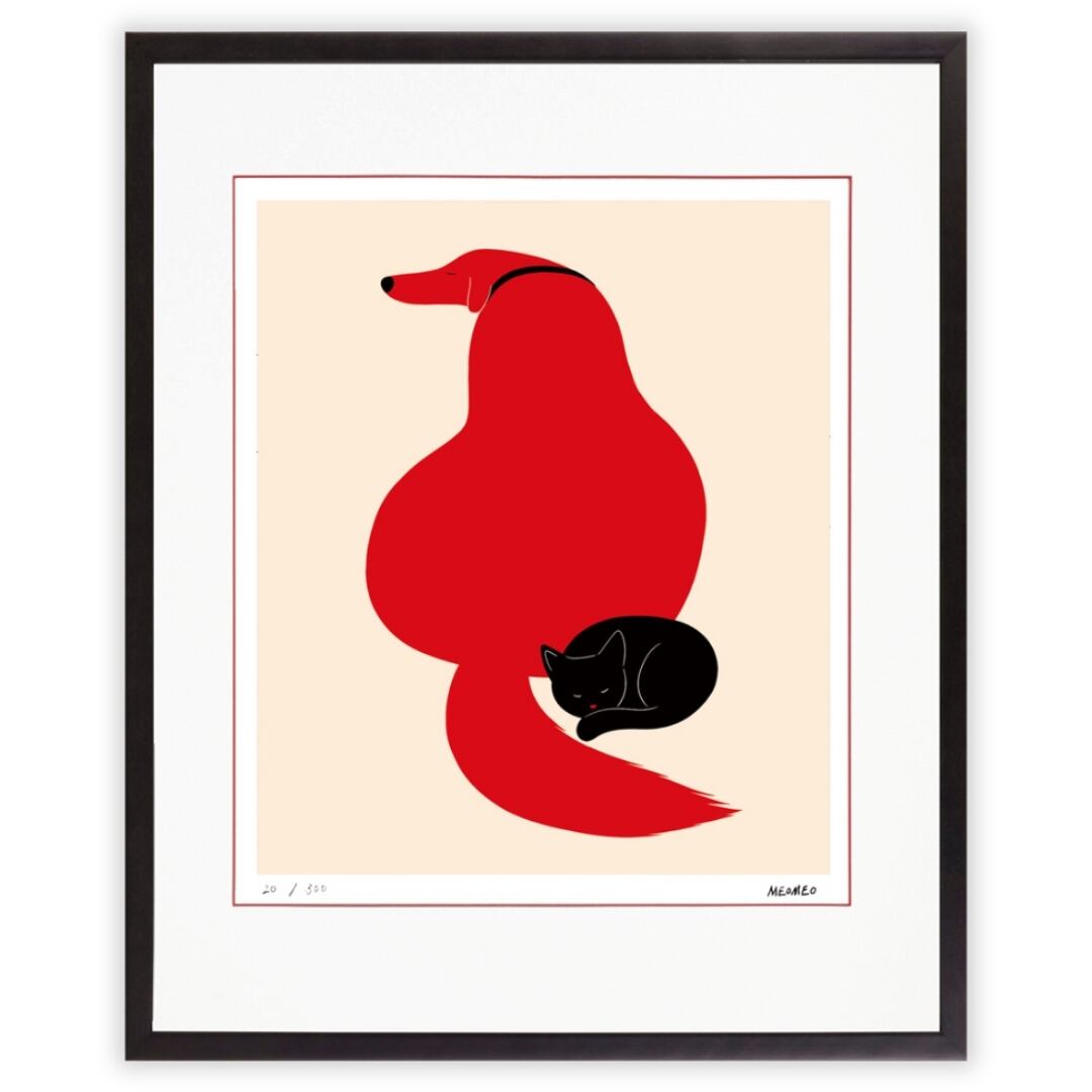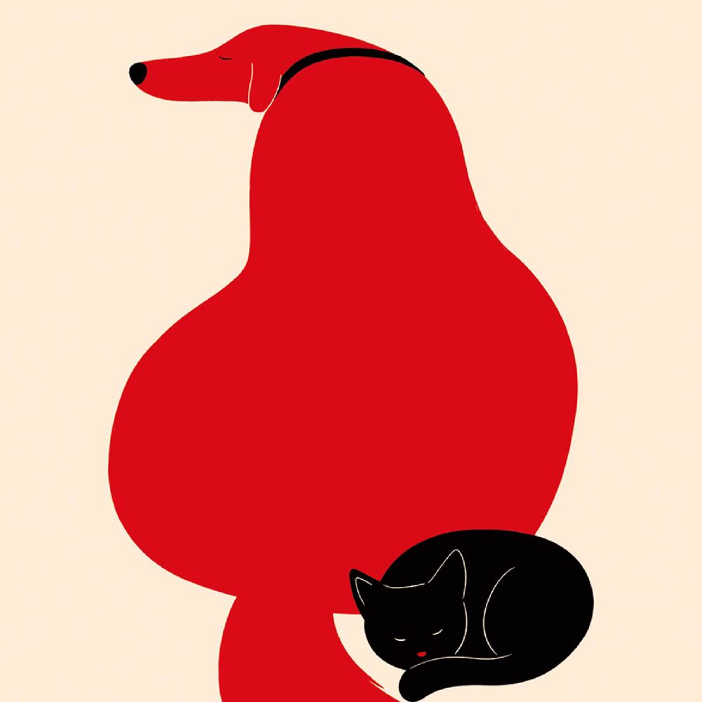 大きな赤い犬が静かに目を閉じ、寄り添うように黒い子猫がその尻尾の上で眠っています。対照的な大きさと色合いがユーモラスでありながら、どこか心温まる安心感をもたらす構図です。犬の落ち着いた表情と、丸く身を縮めて眠る子猫の姿は、信頼や安らぎを象徴しており、観る人に穏やかな感情を呼び起こします。シンプルな線と色面で描かれた造形は、余白の美しさを引き立て、見る者に静かな物語を想像させる力を持っています。二つの存在の間に漂う静けさと優しさが、この作品をより印象深いものにしています。