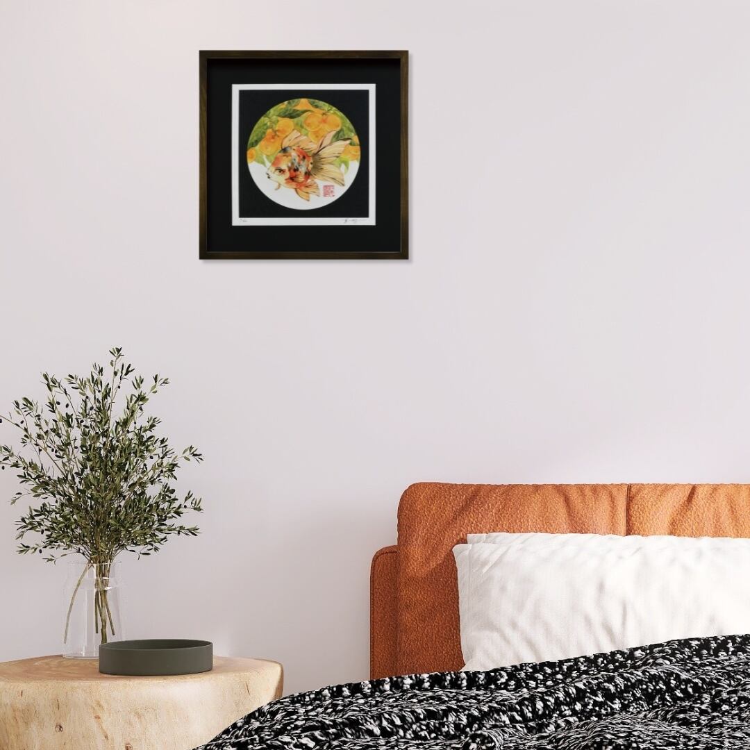 金魚の絵画は、その美しさや儚さを表現する芸術として人気を集めています。本作品は、キャリコ琉金と枇杷を題材にした水彩画で、季節の瑞々しさを感じさせながら、金魚特有の優美さを際立たせています。観賞魚として親しまれる琉金は、女性的な曲線や柔らかな色彩が魅力で、水彩ならではの透明感が繊細に表現されています。インテリアに取り入れることで、初夏の爽やかさとともに上品な雰囲気を演出でき、金魚好きや和モダンなアートを探す方にもおすすめの一枚です。