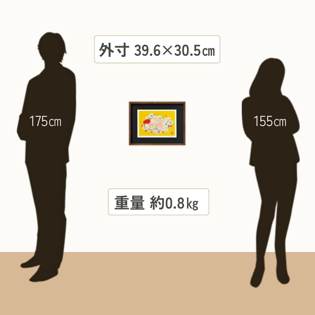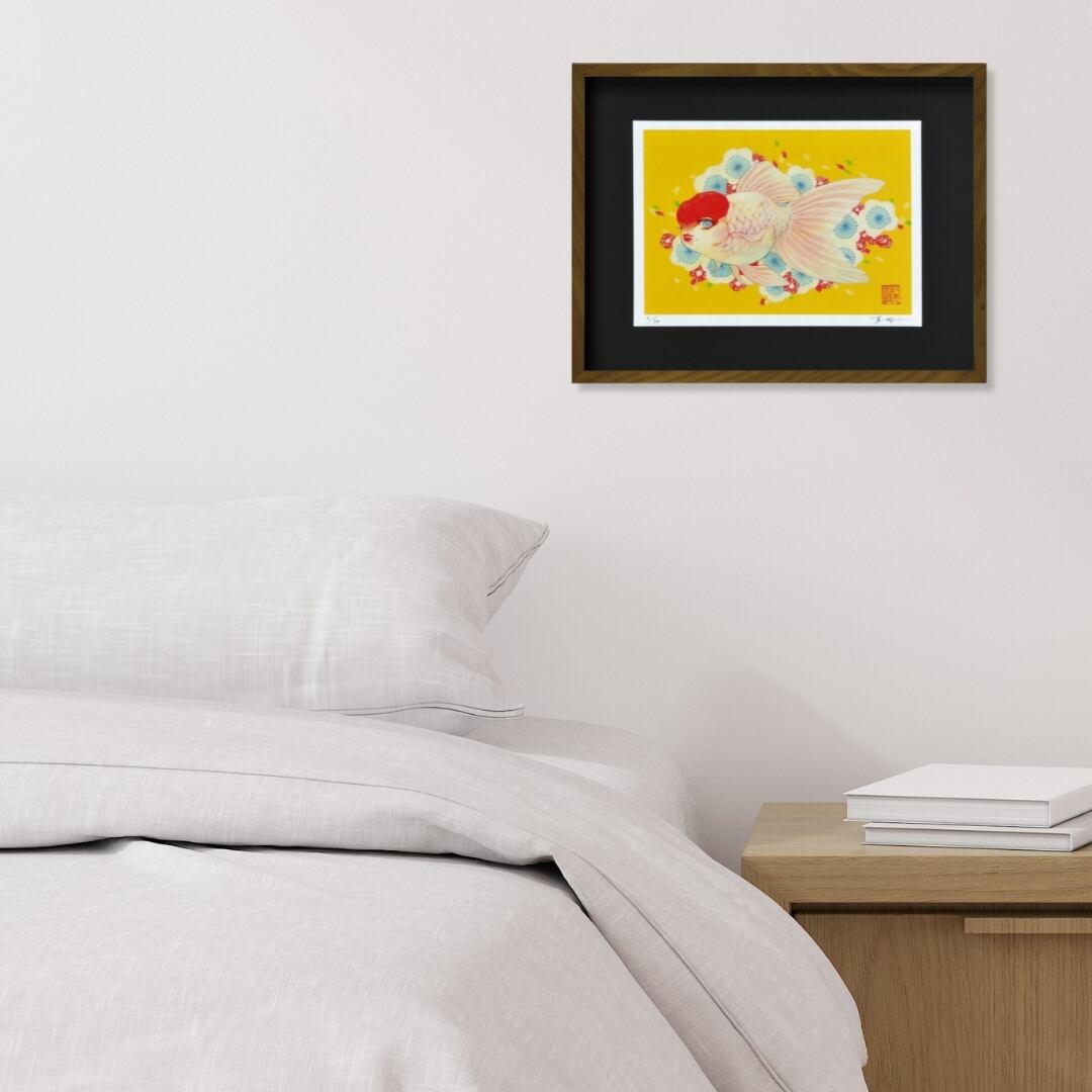 金魚の絵画は日本の夏を彩る題材として人気があり、その艶やかさや儚さを象徴するモチーフです。本作品では、丹頂金魚の赤と白の美しいコントラストが水彩画の柔らかなタッチで表現され、華やかな黄色の背景が夏らしい明るさを際立たせています。丹頂の丸い頭部は愛らしさと同時に女性的な色気を感じさせ、観賞魚の持つ魅力を存分に伝えています。和モダンなインテリアに飾れば季節感を添え、夏を楽しむ空間演出にぴったりの一枚です。