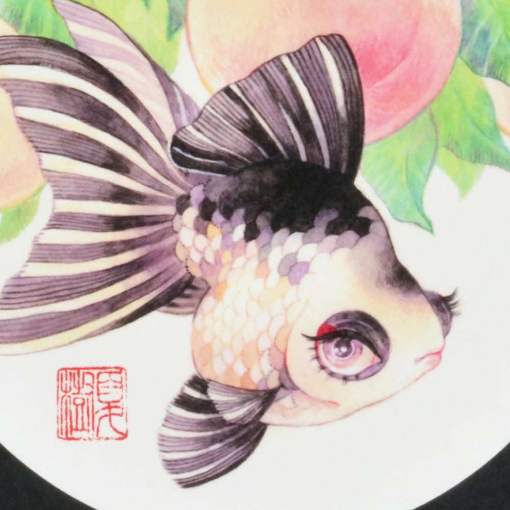丸みを帯びた桃の果実と、白と黒のコントラストが美しいパンダ蝶尾が描かれ、作品全体に優雅で愛らしい雰囲気を漂わせています。ひらひらと舞う尾びれはまるで絹のように柔らかく、女性の優美な姿を想起させます。背景の桃は豊穣や長寿を象徴する果実であり、瑞々しさと温かみを添えています。観賞魚特有の儚さや繊細さと相まって、愛らしさと気品を兼ね備えた印象を与える作品となっています。眺めるほどに柔らかな幸福感を感じさせる一枚です。
