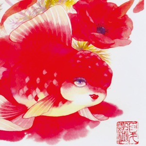 真紅の花々と赤い金魚が画面いっぱいに咲き誇り、視線を奪うような鮮烈な美しさを放っています。ふんわりと広がる尾びれは柔らかなドレスのようで、女性の華やかさと艶やかさを感じさせます。赤の濃淡で描かれた花々は情熱や官能を象徴し、そこに儚げな視線を向ける金魚が寄り添うことで、単なる華美さを超えた深みを生み出しています。燃えるような赤は生命の強さを表すと同時に、消えてしまいそうな刹那の美しさをも含み、観る者の心に強く響く作品です。