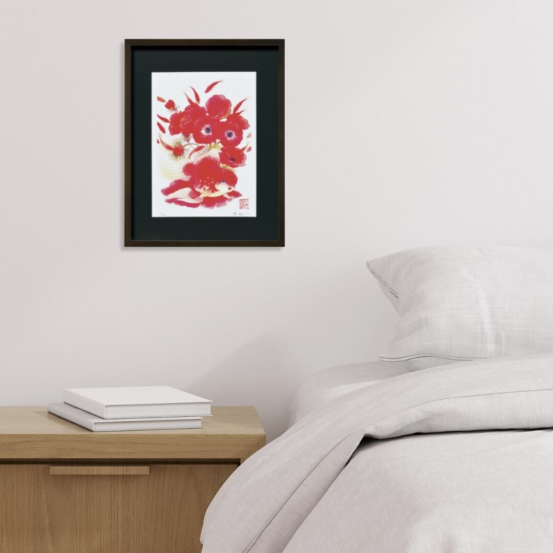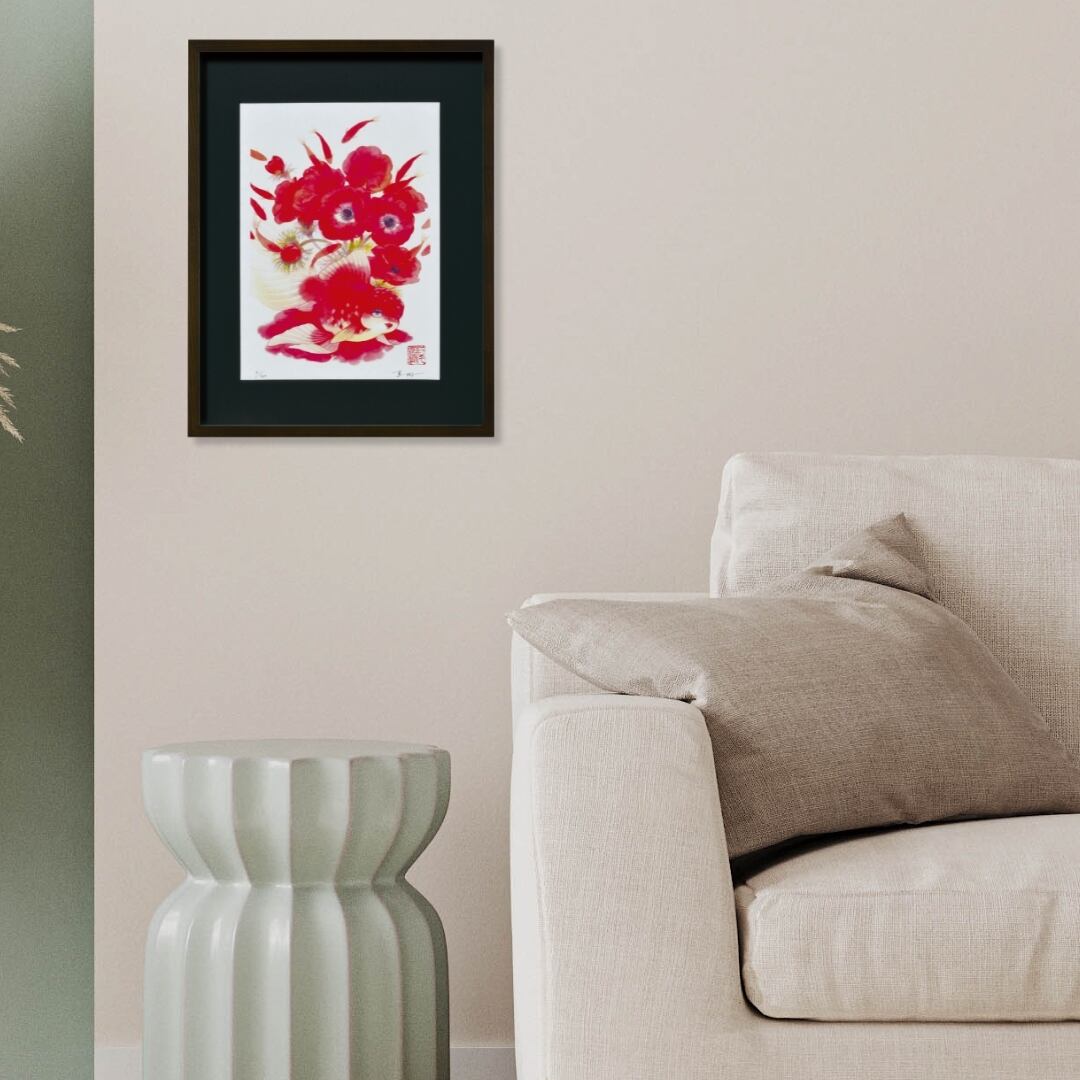 金魚をモチーフとした絵画は、その優雅な姿と儚い命の象徴性から人気を集めています。本作品では、赤く染まった花々と金魚が一体となり、情熱的で女性的な魅力を描き出しています。赤は愛や生命力を象徴し、華やかさの中に潜む刹那的な美しさを表現しています。水彩ならではの柔らかな筆致が金魚の鱗や尾びれを繊細に描き出し、観賞魚特有の色気を引き立てています。インテリアとしても空間を華やかに演出し、観る人に強い印象と感動を与えるアート作品です。