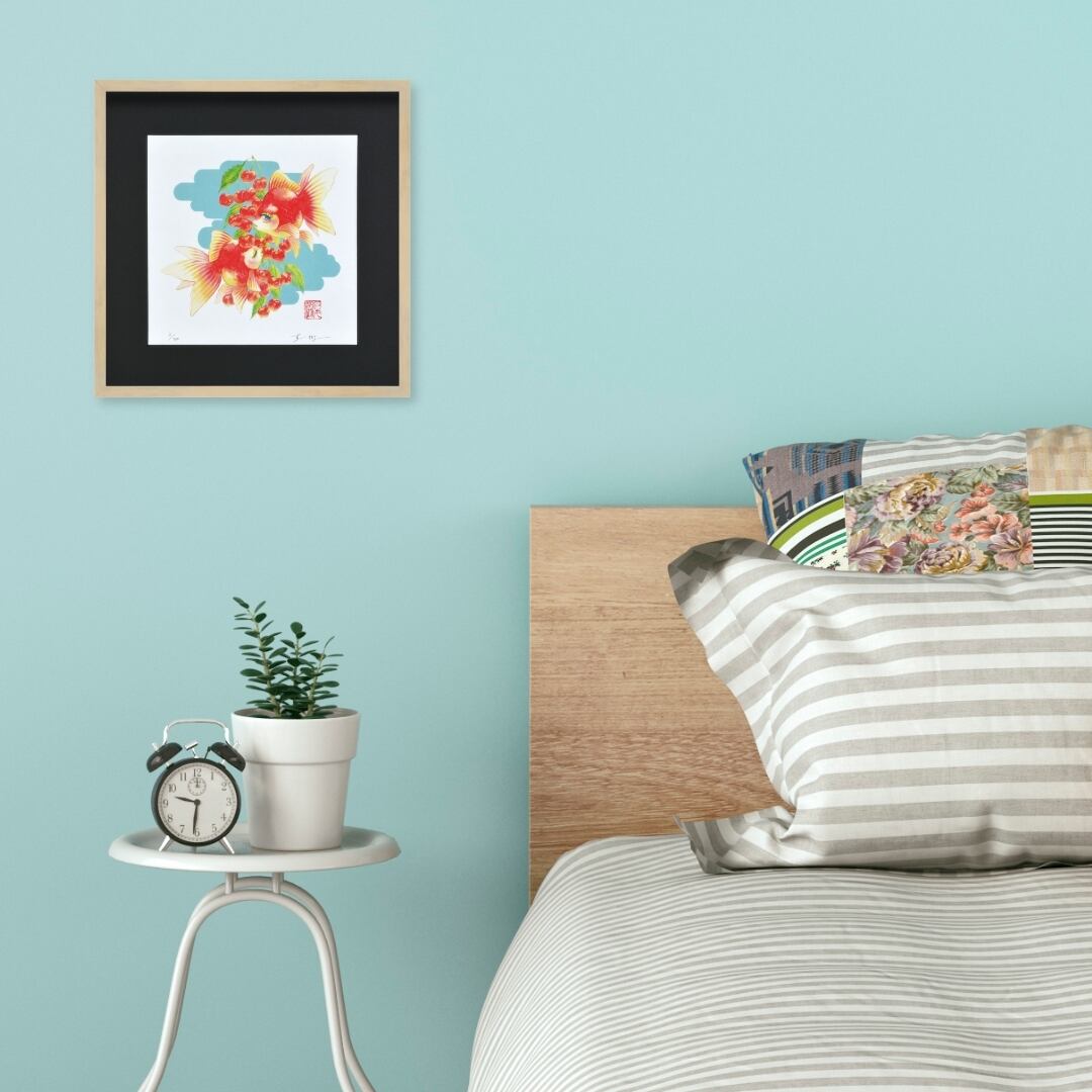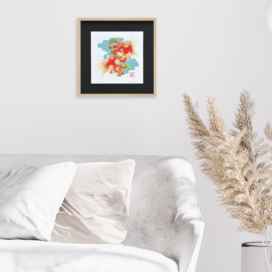 艶やかな金魚を題材にした水彩画は、その女性的な美しさと観賞魚ならではの儚さを魅力的に表現します。本作品では、赤く熟したさくらんぼと金魚が組み合わされ、甘美で官能的な世界が広がります。大きな瞳や曲線美あふれる尾びれが色っぽさを感じさせ、まるで恋に酔う女性を思わせる姿が描かれています。鮮やかな赤と緑、そして背景の青とのコントラストは視覚的なインパクトを与え、インテリアとしても華やぎを添える一枚です。美しさと儚さが共存する金魚アートとして、多くの人の心を惹きつける作品です。
