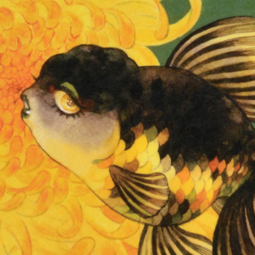 深い緑の背景に浮かび上がるのは、黄金の菊と黒阿蘭陀金魚の対比です。金魚の漆黒と金色の斑模様は、菊の華やかさと呼応するように輝き、重厚な存在感を放っています。ゆったりと広がる尾びれと優雅な姿態には、女性的な艶やかさと同時に静かな気品が漂います。大輪の菊は命の燃え盛る瞬間を象徴し、金魚の大きな瞳には儚さと憂いが宿ります。美と寂寥が一体となり、観る者の心に余韻を残す一枚です。