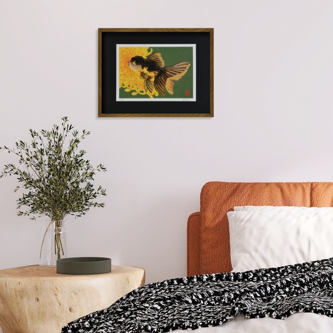 黒阿蘭陀金魚と菊の花を組み合わせた幻想的な水彩画アートです。深い緑の背景に映える黒と金のコントラストが、観賞魚の美しさを際立たせています。優雅に広がる尾びれは女性的な艶やかさを感じさせ、一方で大きな瞳に宿る儚さが印象的。大輪の菊は生命の輝きを象徴し、金魚の存在感と調和しています。インテリアアートとして空間に重厚さと華やぎを添えるだけでなく、金魚の持つ美と寂しさを深く表現した作品です。金魚や花をテーマにしたアートを求める方におすすめです。