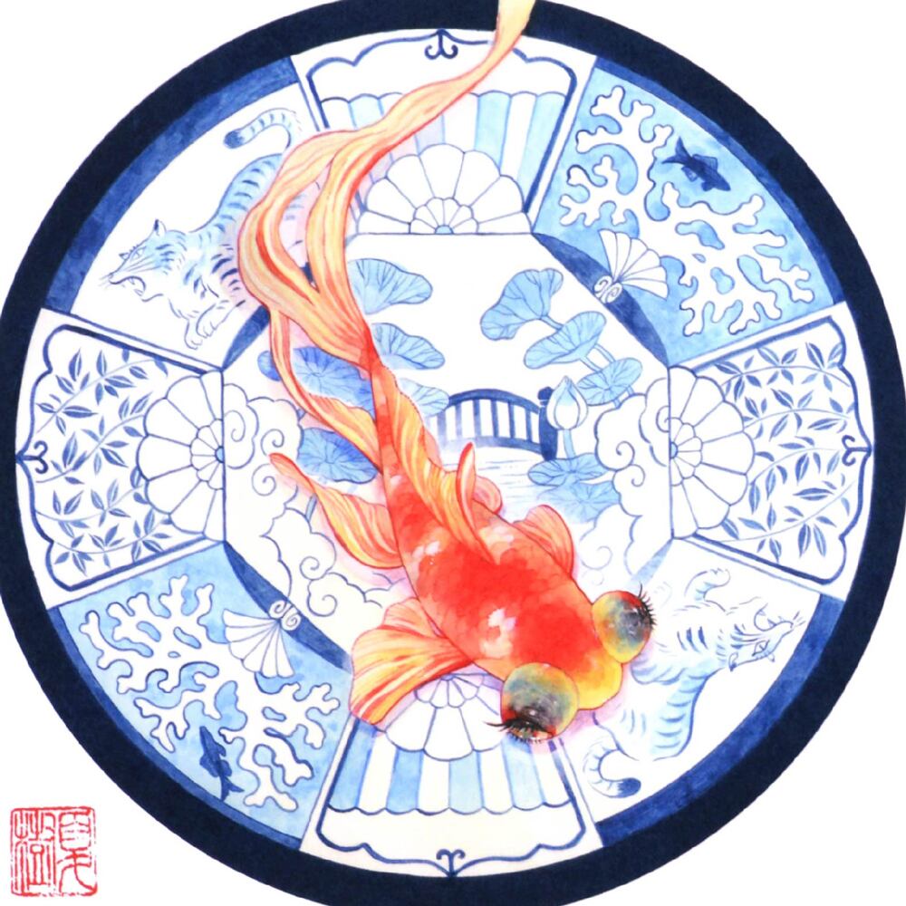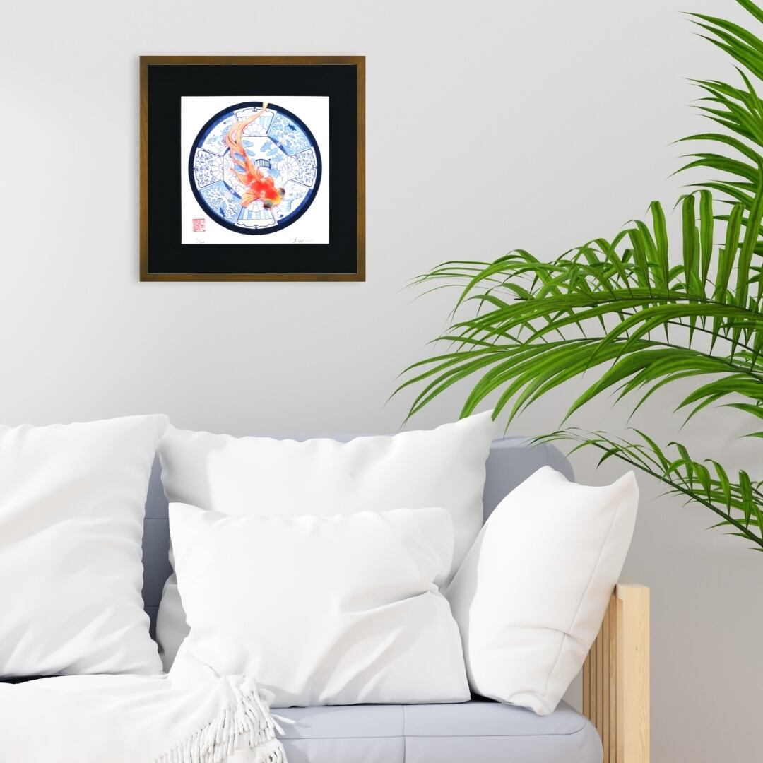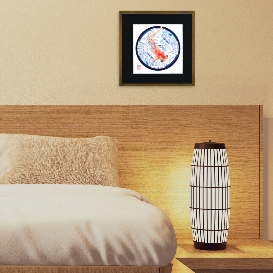 藍色の染付文様が印象的な器を背景に、朱赤の金魚を描いた水彩画です。長い尾びれが柔らかく広がり、まるで水面を舞うような姿が魅力的です。日本の伝統美と観賞魚の艶やかさを融合させた構図は、インテリアアートとしても調和しやすく、空間に上品な清涼感をもたらします。金魚の美しさや儚さを象徴的に描いたこの作品は、夏を彩るアートとしてだけでなく、和の雰囲気を大切にした暮らしにも寄り添う一枚です。