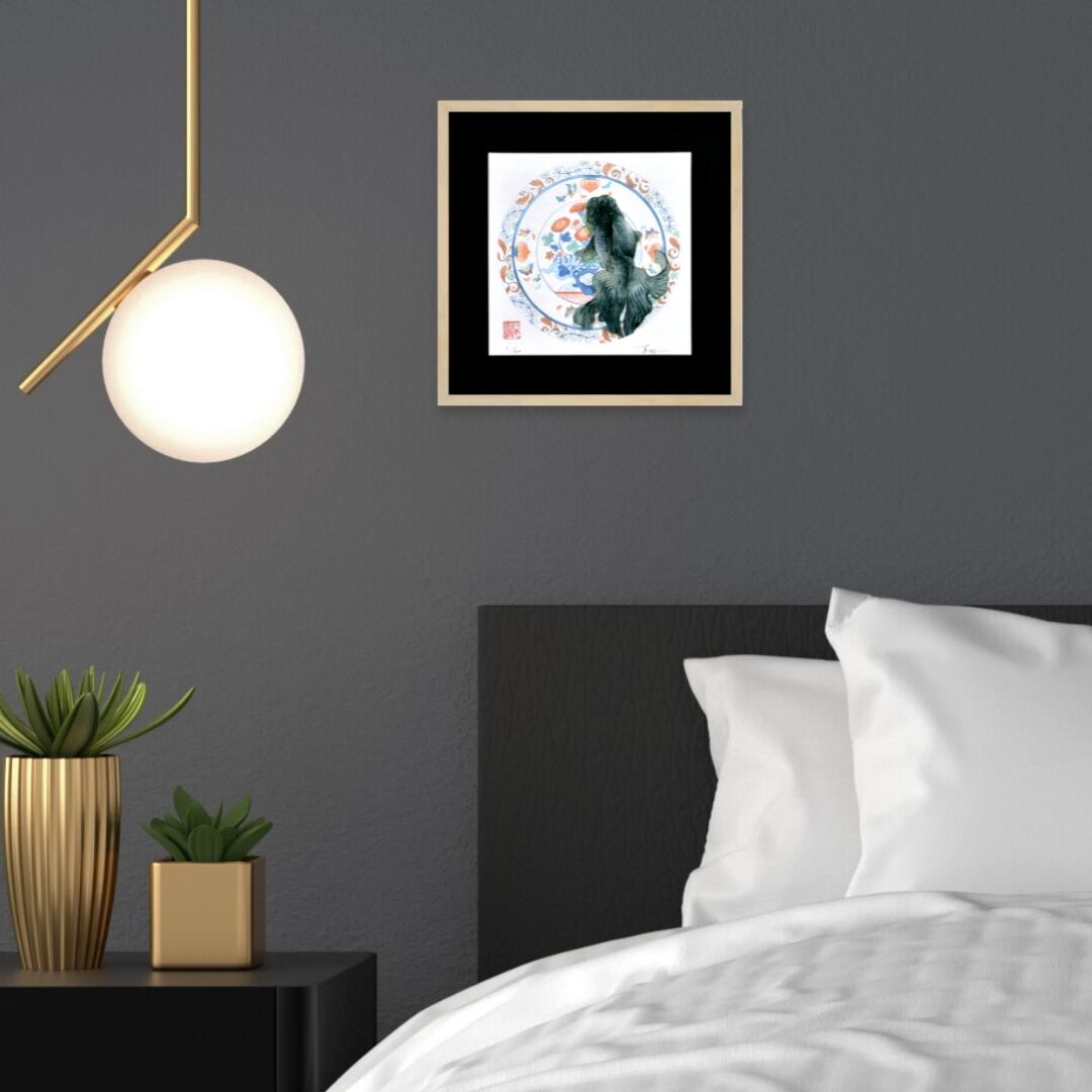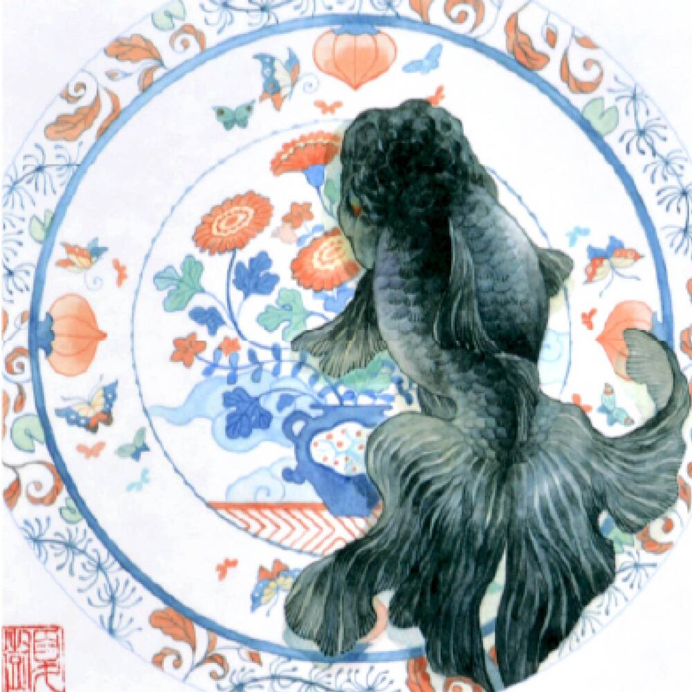 伝統的な器の文様と黒い金魚を組み合わせた水彩画です。華やかな花の意匠と漆黒の金魚のコントラストが美しく、作品全体に上品で落ち着いた雰囲気をもたらします。金魚の柔らかな曲線や光沢感は、観賞魚としての気品を表現し、空間に高級感を添えるインテリアアートとしても魅力的です。和の意匠と現代的な感性が調和したデザインは、伝統美を取り入れながらも個性を際立たせたい方におすすめの一枚です。