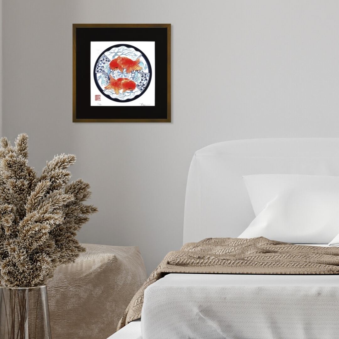 「春の器」は、藍色の伝統文様と朱色の金魚を組み合わせた華やかな水彩画です。二匹の金魚が寄り添うように配置され、春らしい喜びと生命力を表現しています。器に描かれたうさぎや花模様が縁起の良さを象徴し、和の雰囲気を漂わせながらもモダンな感覚を兼ね備えています。赤と青のコントラストは空間を明るく彩り、リビングや玄関などに飾れば季節感を演出できるアート作品です。春を感じさせるインテリアや贈り物としても最適な一枚となっています。