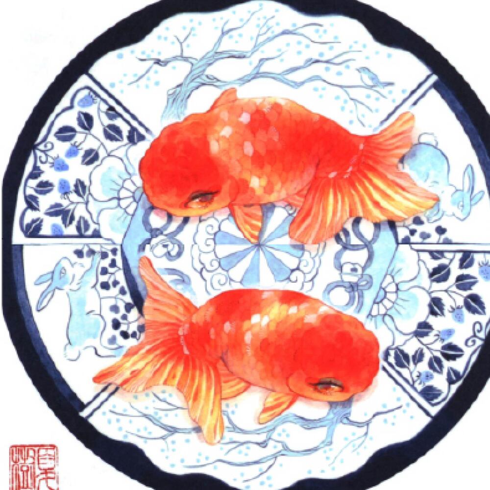 藍色の器に描かれたうさぎや花の模様の上を、二匹の朱色の金魚が並んで泳いでいます。その鮮やかな赤は春の息吹を感じさせ、柔らかい丸みを帯びた体つきが愛らしく、まるで仲睦まじい様子を映しているようです。器の繊細な文様と金魚の生き生きとした姿が調和し、画面に穏やかな時間が流れているように感じられます。春の訪れを寿ぐような温もりにあふれた作品であり、観る人の心を晴れやかにしてくれる一枚です。