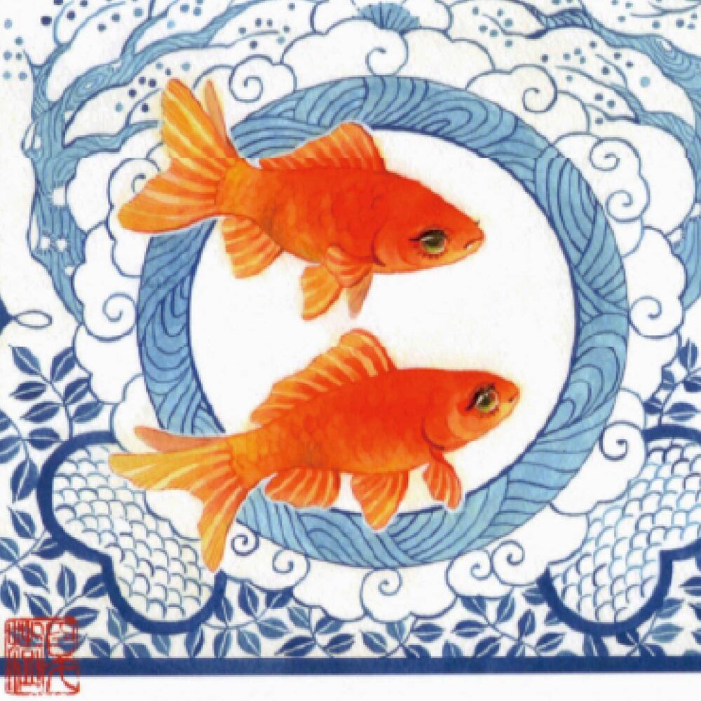 藍色の器の中央に描かれた白地の空間を背景に、二匹の朱色の金魚がゆったりと泳いでいます。その鮮やかな色合いは春の陽射しを思わせ、柔らかな水の中で命が芽吹く瞬間を象徴しているようです。周囲を囲む雲や草木の文様が、まるで金魚たちを祝福するかのように優しく寄り添い、作品全体に清らかで明るい気配を漂わせています。金魚たちの素朴で親しみやすい姿は、観る者に穏やかな安心感と新しい季節の喜びを伝えてくれる一枚です。