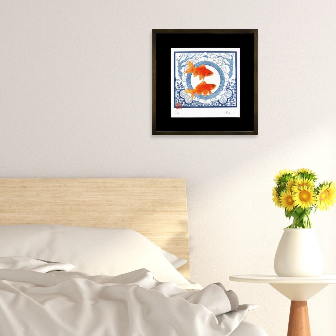 「春の訪れ」は、藍色の器文様と朱色の金魚を組み合わせた、季節感あふれる水彩画です。明るい白地に浮かぶ二匹の金魚は、春の生命力や再生を象徴し、空間に爽やかな印象をもたらします。器の装飾には伝統的な雲や草木の意匠が施され、和の美意識を感じさせつつ、モダンなインテリアにもよく馴染むデザインです。玄関やリビングに飾ることで、空間を軽やかに彩り、春の明るい雰囲気を演出します。贈り物やお祝いの品としても最適なアート作品です。