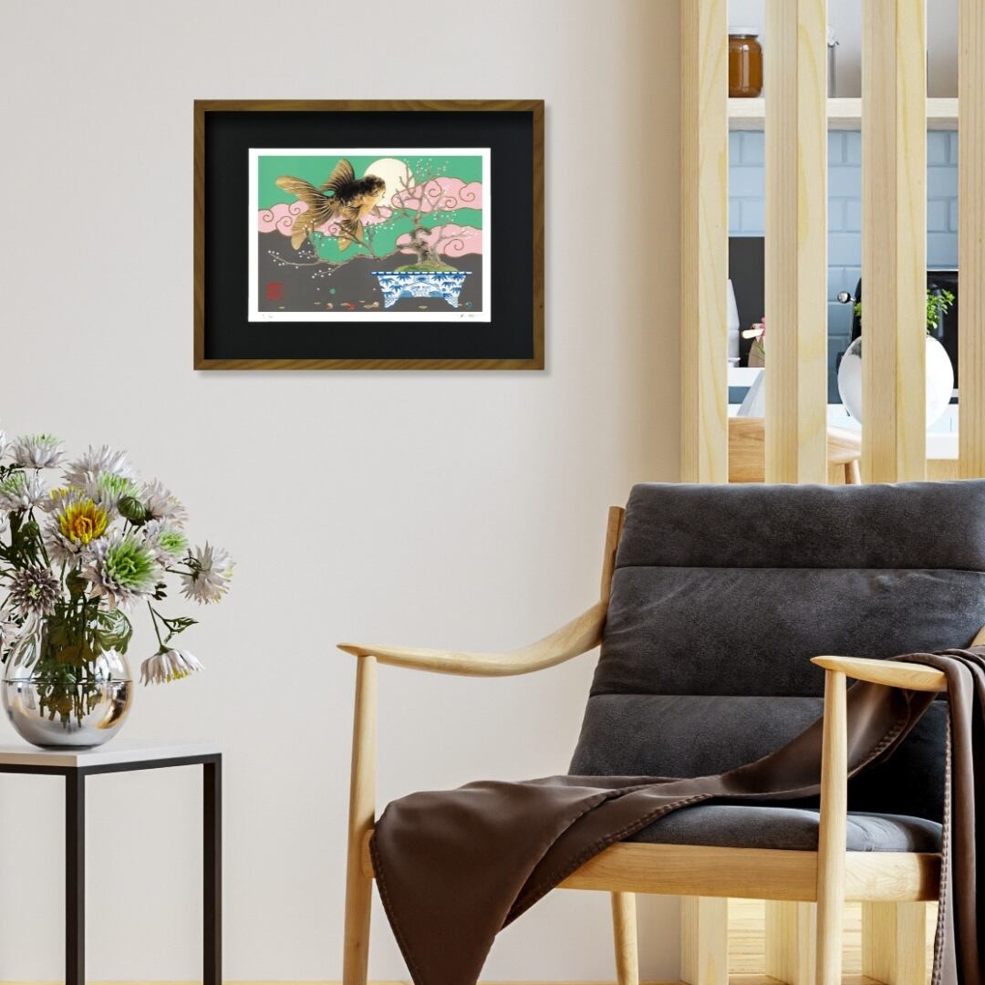 満月を背景に、盆栽の梅と金魚のオランダ獅子頭がひとつの画面に溶け合うように描かれています。梅の枝に咲く可憐な白い花と、幻想的な桃色の雲が春の訪れを告げる中、堂々と泳ぐ金魚はまるで空を翔けるかのようです。金魚の豊かな体躯と金色の鱗の輝きが、静かでありながらも力強い生命力を放っています。伝統的な器の意匠が画面全体を引き締め、古典的な美と幻想的な世界観が調和した作品となっています。