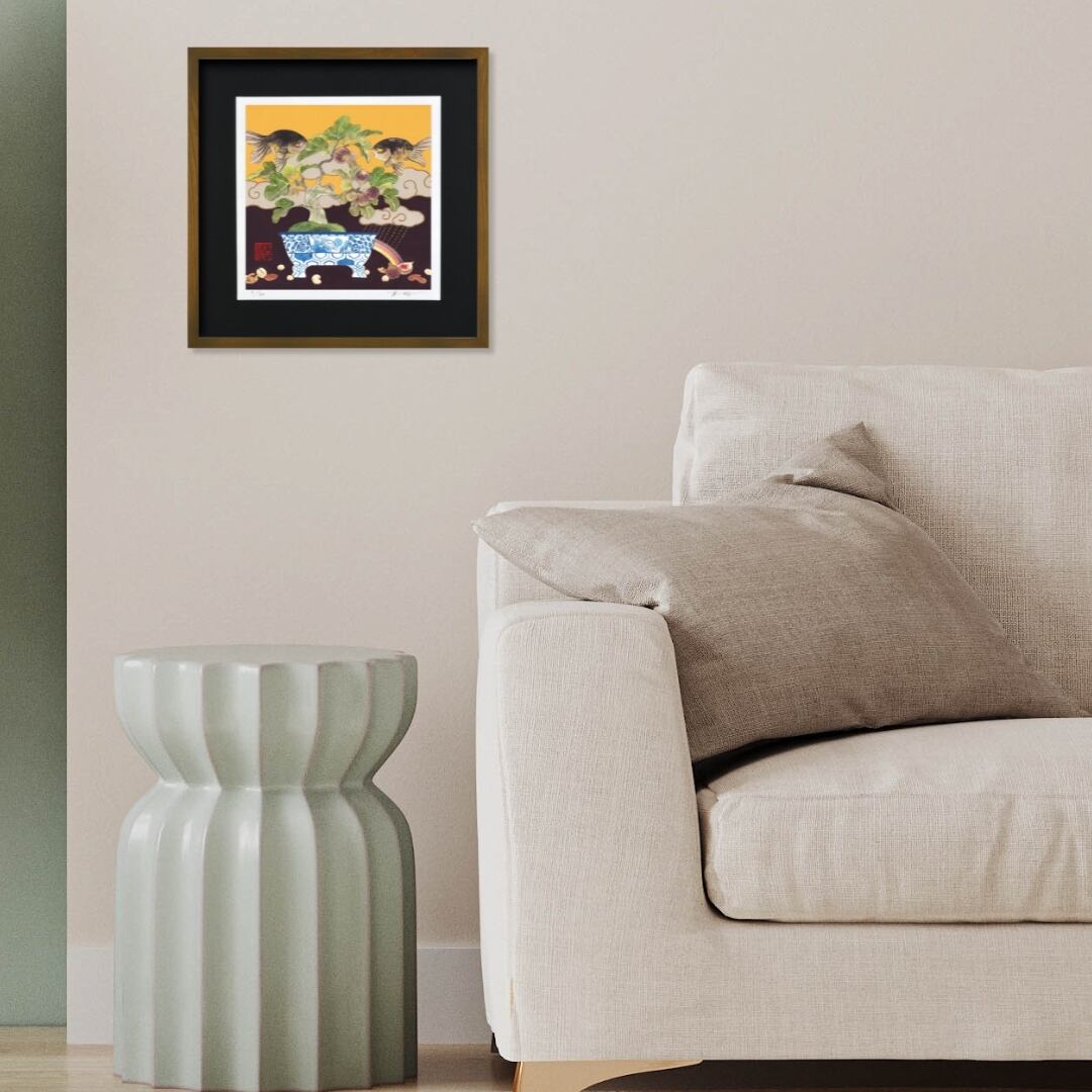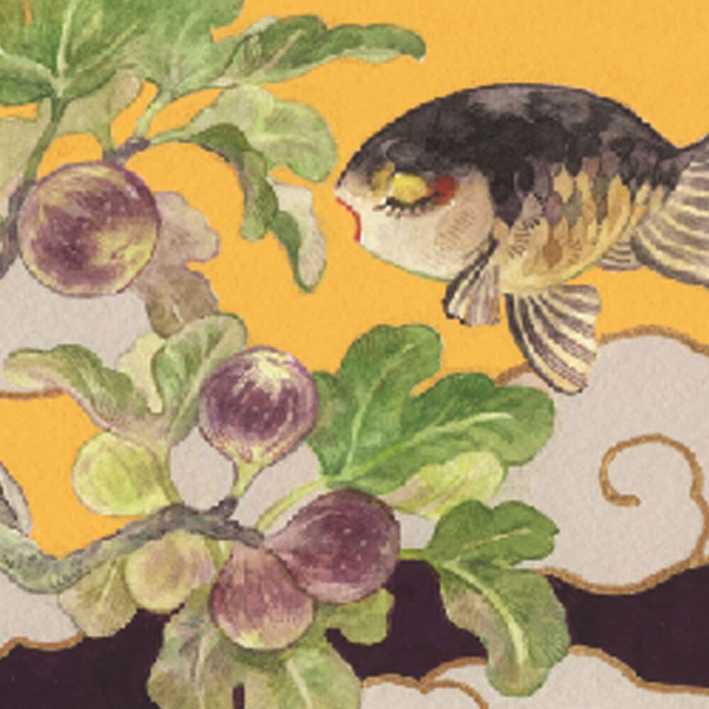 瑞々しく実った無花果と、優雅に泳ぐ黒らんちうが描かれた金魚アートは、豊穣さと品格を感じさせる仕上がりです。深い紫の果実と黄金色の背景が絶妙に調和し、見る者に秋の実りを思わせます。漆黒の体をもつ金魚が対照的に浮かび上がり、インテリア絵画としても存在感のある一枚です。青磁の器に施された繊細な文様が全体を引き締め、伝統美と自然の調和を巧みに表現しています。静かでありながら豊かな世界観が漂い、日常空間に優雅な彩りを添えてくれます。