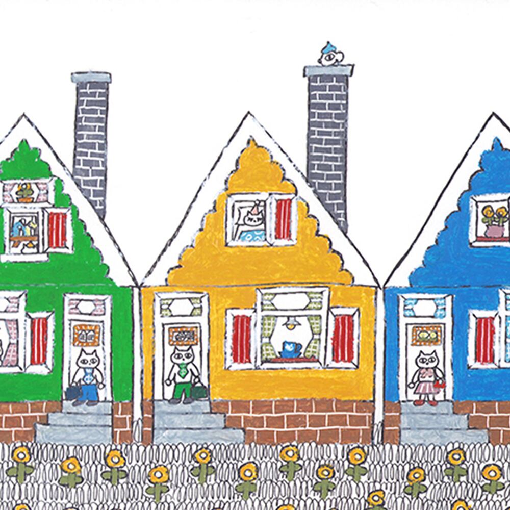 緑・黄色・青の三色の家が並び、それぞれの玄関を住人の猫が開けて出勤する瞬間が描かれています。手前にはひまわり畑が広がり、柔らかな色合いと光の表現が朝の爽やかさを感じさせます。青い家から一歩踏み出す猫や、黄色い家からこちらを見つめる猫、緑の家から歩き出そうとする猫など、三匹それぞれの動きが愛らしく、まるで物語の一場面を切り取ったようです。見ているだけで心がほっとする、温かな魅力にあふれています。