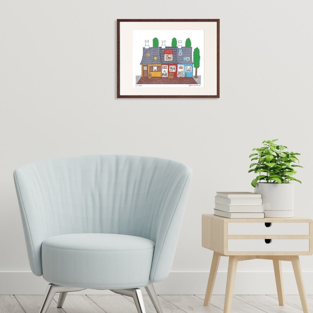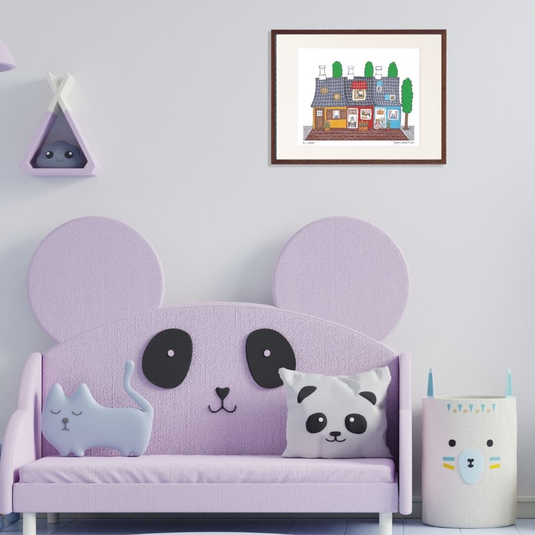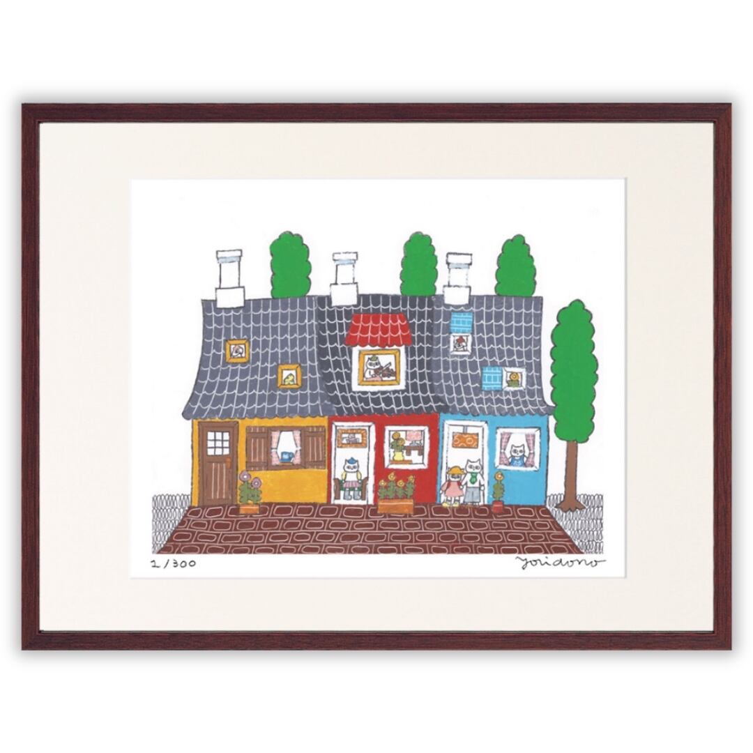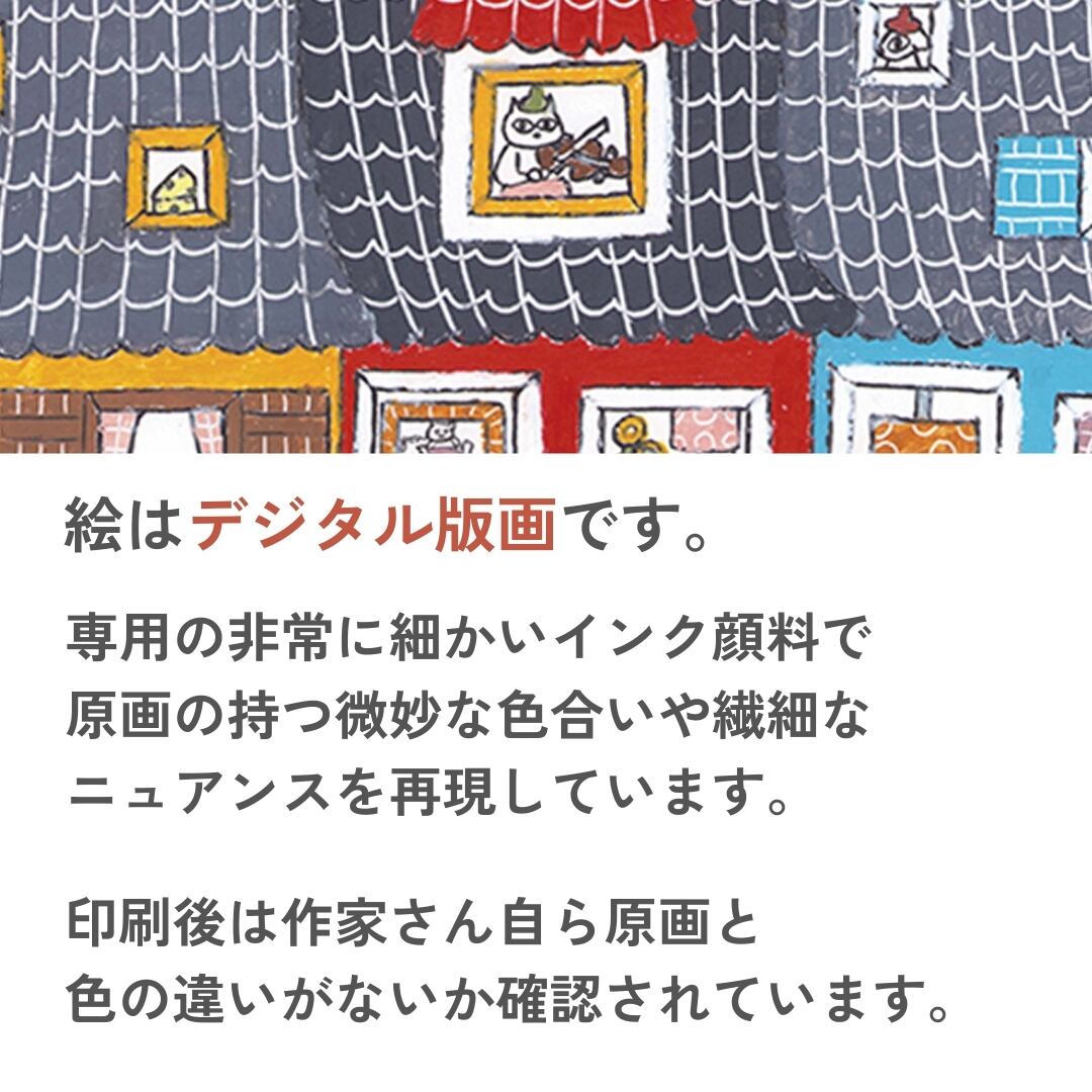 レンガ調の長屋がカラフルに描かれ、その窓辺や屋根には愛らしいねこたちが姿を見せています。赤やイエロー、ブルーなどカラフルな色彩が組み合わされ、建物自体がまるで生き生きと呼吸しているように感じられます。窓から外を眺めるねこ、屋根の上でくつろぐねこ、それぞれの仕草がユーモラスで、見る人の心をくすぐります。はっきりとした色調とリズムのある構図は、作品全体を明るく華やかな印象にまとめ、視覚的な楽しさを存分に味わえるイラストです。日常の中で、ふとした瞬間に笑顔を運んでくれるような、温かく鮮やかなアートといえるでしょう。