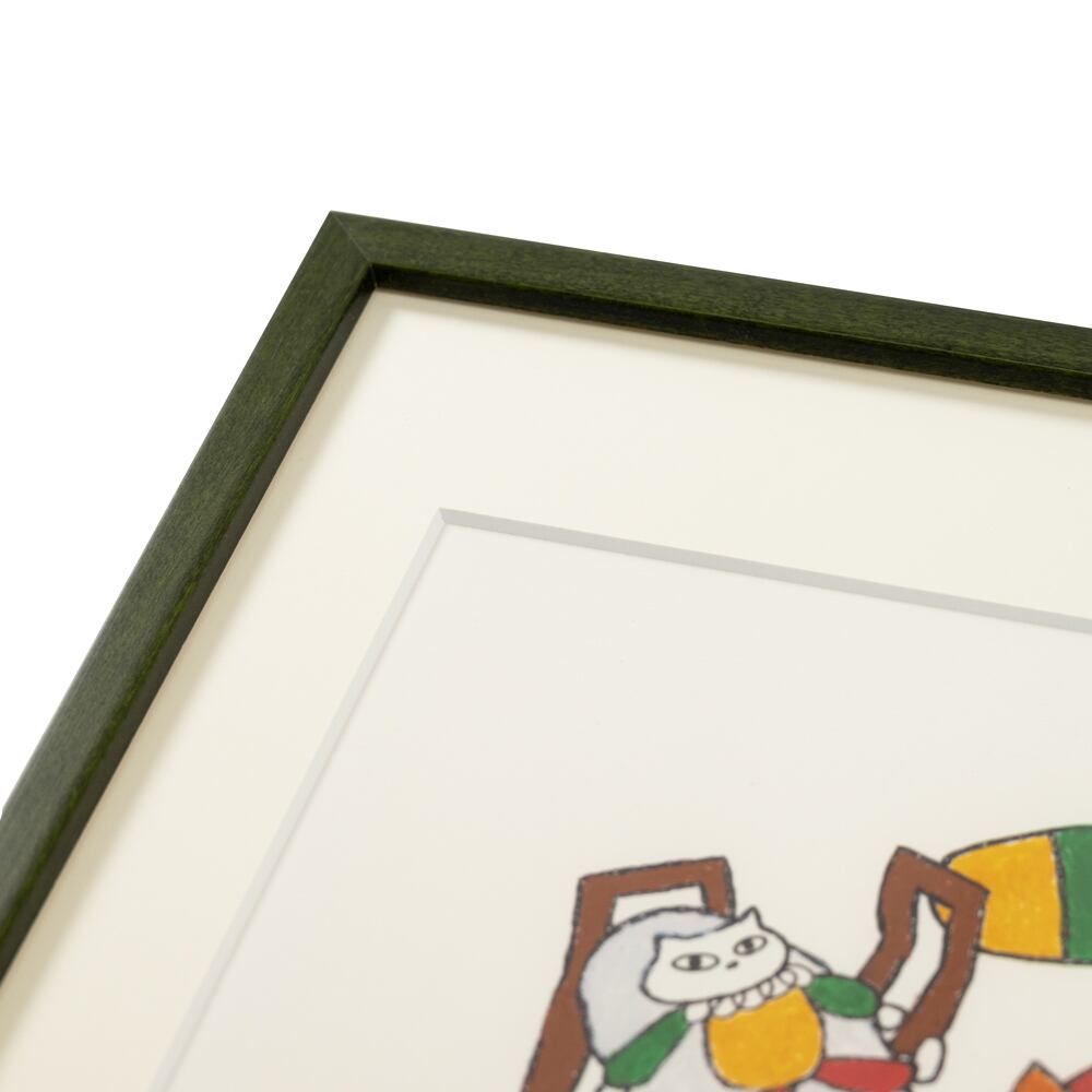 この額装品を部屋に飾ると、空間にあたたかくやさしいムードが漂い、視線を向けるたびにほんのりと元気が蘇ります。カラフルな椅子とネコたちのゆるやかな佇まいが、部屋に遊び心と癒しをもたらし、どこかホッとできる空気を演出します。たとえばリビングやこども部屋、廊下など、やわらかな色彩が調和する空間に置くと、見る人を楽しませながらインテリアアートとしての存在感も発揮します。日常の中に“ささやかな幸せ”を添え、ふと立ち止まって心を休ませてくれる、暮らしに寄り添うやさしいアートです。