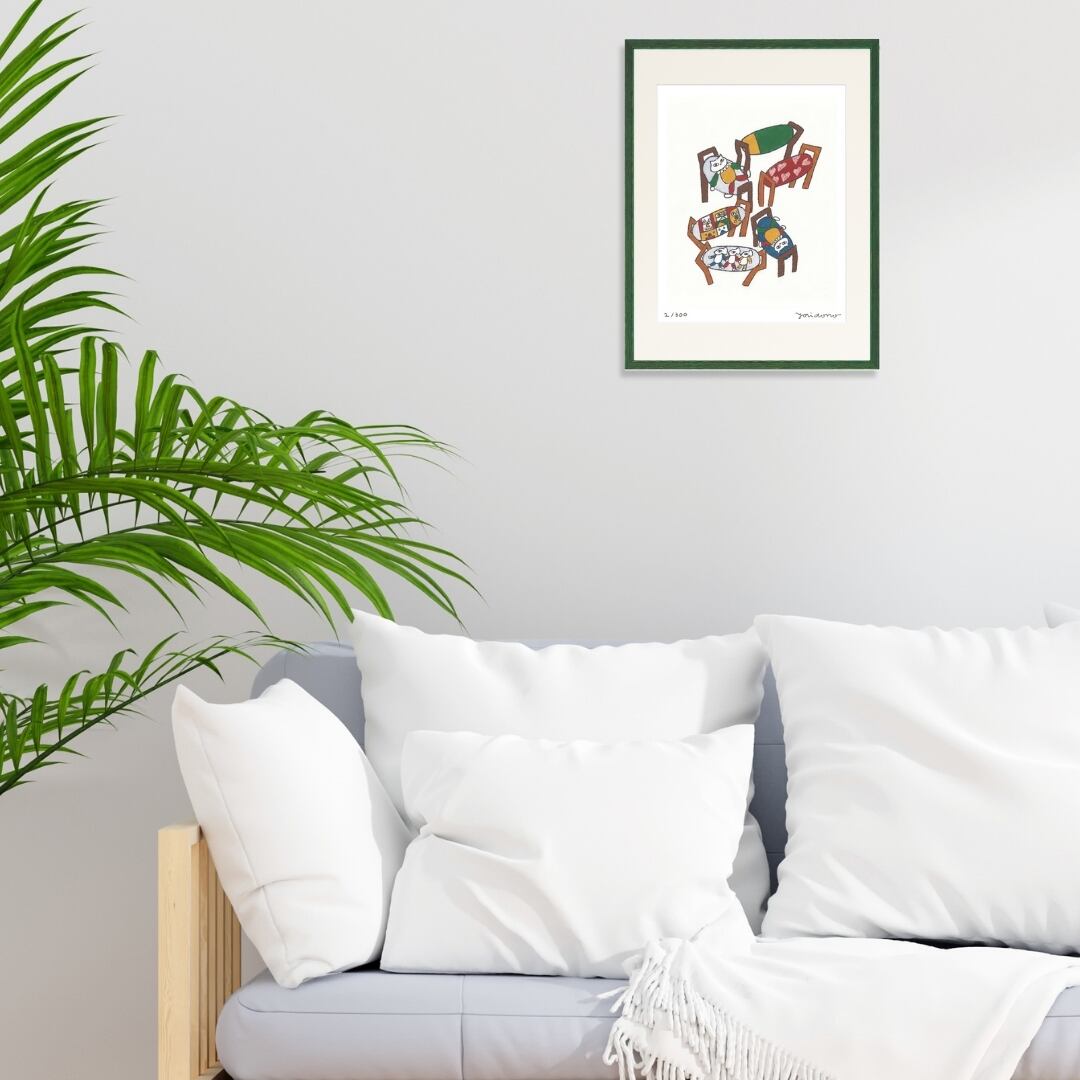 ひとつひとつ異なる色の椅子を舞台に、擬人化されたネコたちが伸びやかに寛いでいる様子が描かれています。柔らかい線と温かな色調で、ネコの体のフォルムも愛らしく表現され、見るたびに思わずほほえみがこぼれます。赤、緑、黄、ブルーなどパステル調から鮮やかな色まで、多彩な椅子の色がネコたちの個性を引き立て、にぎやかさと調和を同時に感じさせる構図です。彼らはまるで友だち同士で寄り添ってお昼寝中か、気ままにおしゃべりしているよう。イラストならではの柔らかさとユーモアが共存する、インテリアアートとして心に残る一枚です。