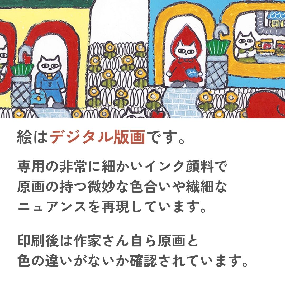 カップやポットにぎっしりと収まった猫たちは、どの子も無表情ながらも独特の存在感を放っています。一軒家の玄関からは、出勤に向かう猫、買い物に行く猫、単車にまたがる猫など、日常を思わせるユーモラスな光景が広がります。無表情だからこそかえって可笑しみがあり、見ているうちに小さなストーリーが浮かんでくるようです。鮮やかな色彩と柔らかな線のタッチが調和し、イラストならではの親しみやすさを感じさせる作品です。額装品として仕上げられることで、アートとしての完成度が一層際立っています。