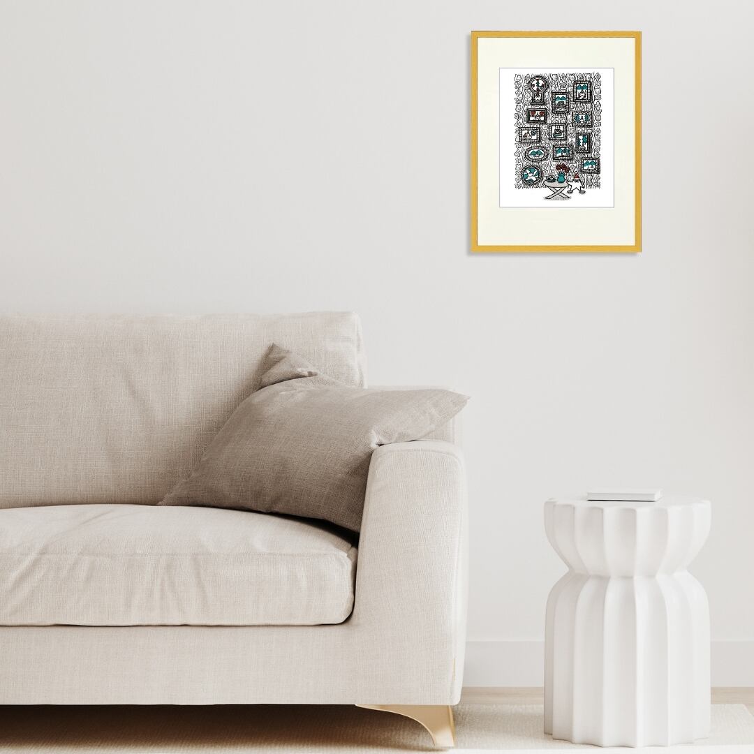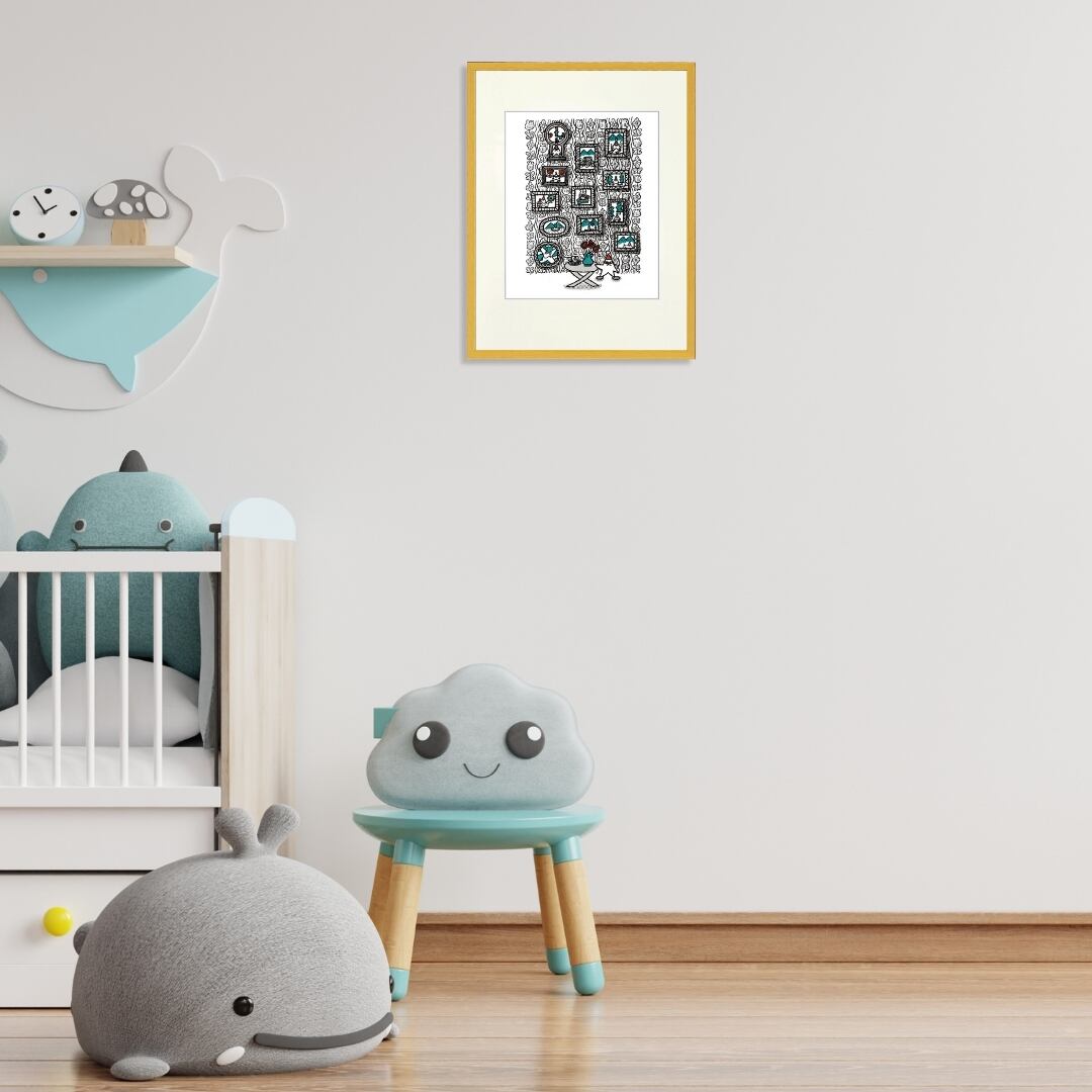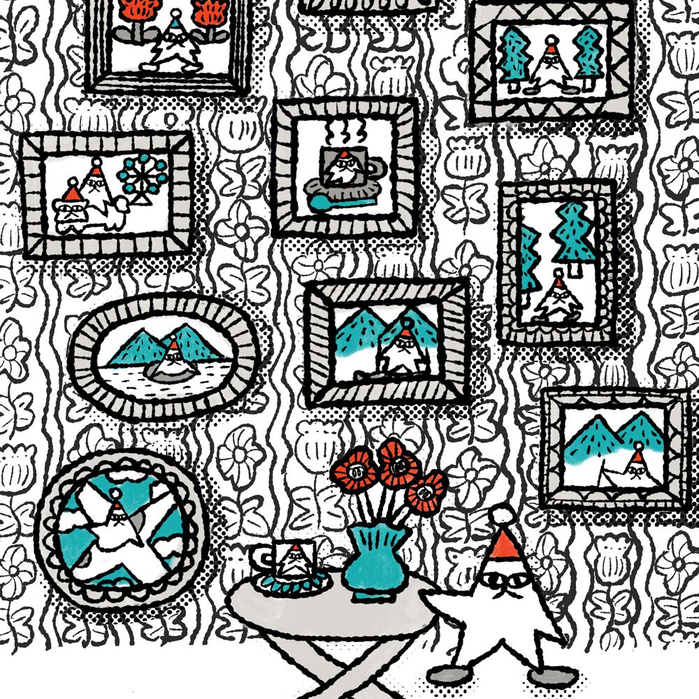 壁いっぱいに整然と並ぶ小さな額縁には、山や海、森、街角といった旅の風景がひとコマずつ収められ、まるで思い出がパッチワークのように並んでいます。特徴ある縦柄の壁紙が背景にリズムを与え、前景の丸テーブルには花瓶と小さな雑貨が控えめに置かれています。無表情の星キャラクターがひとり、そっと立ち尽くし写真を見つめる姿からは余白が生まれ、見る者の想像を促します。細い線描と限定色の差しが効いた可愛らしいタッチのイラストで、鑑賞するほどに細部のユーモアや物語性が見えてくる一枚です。インテリアアートとしても映える描写です。