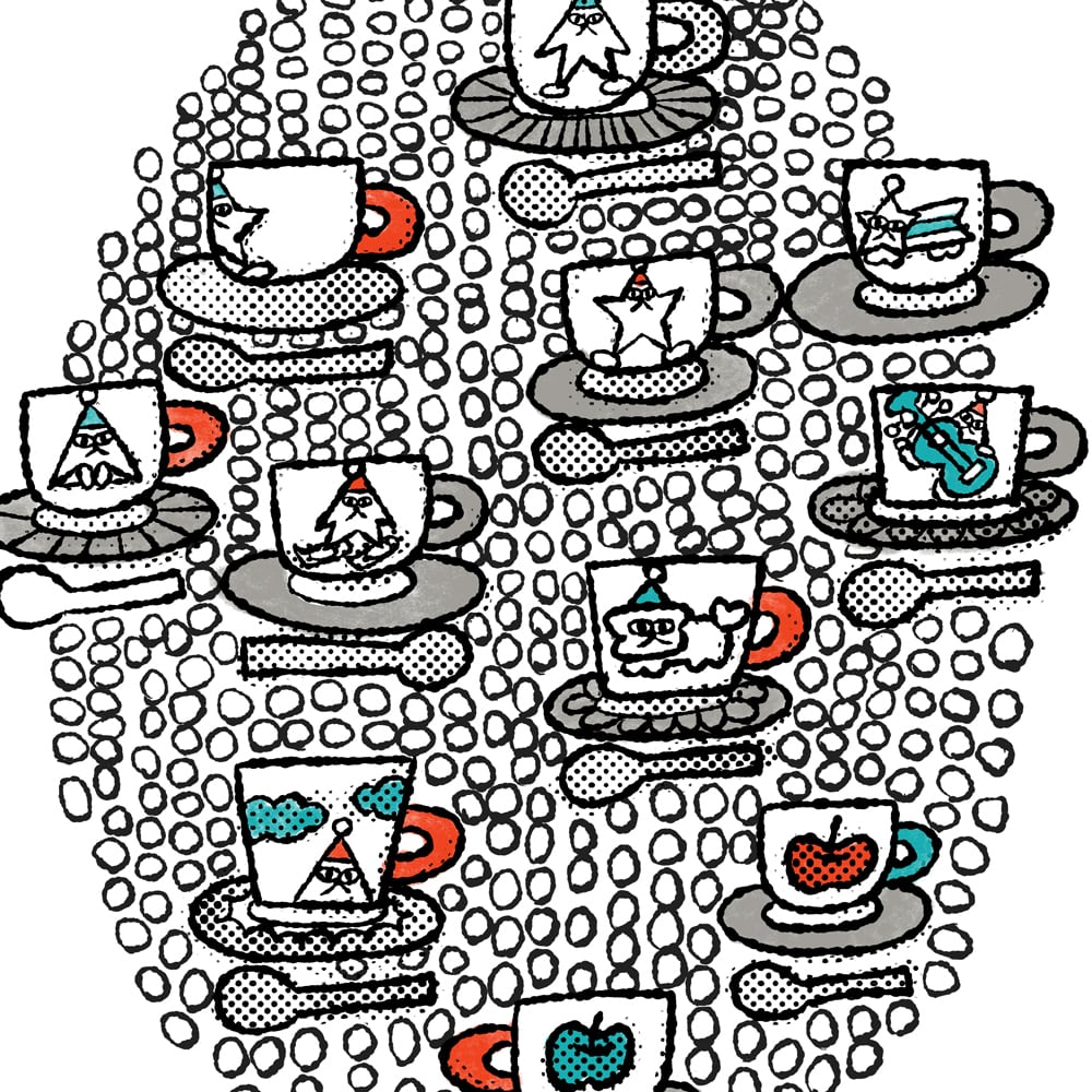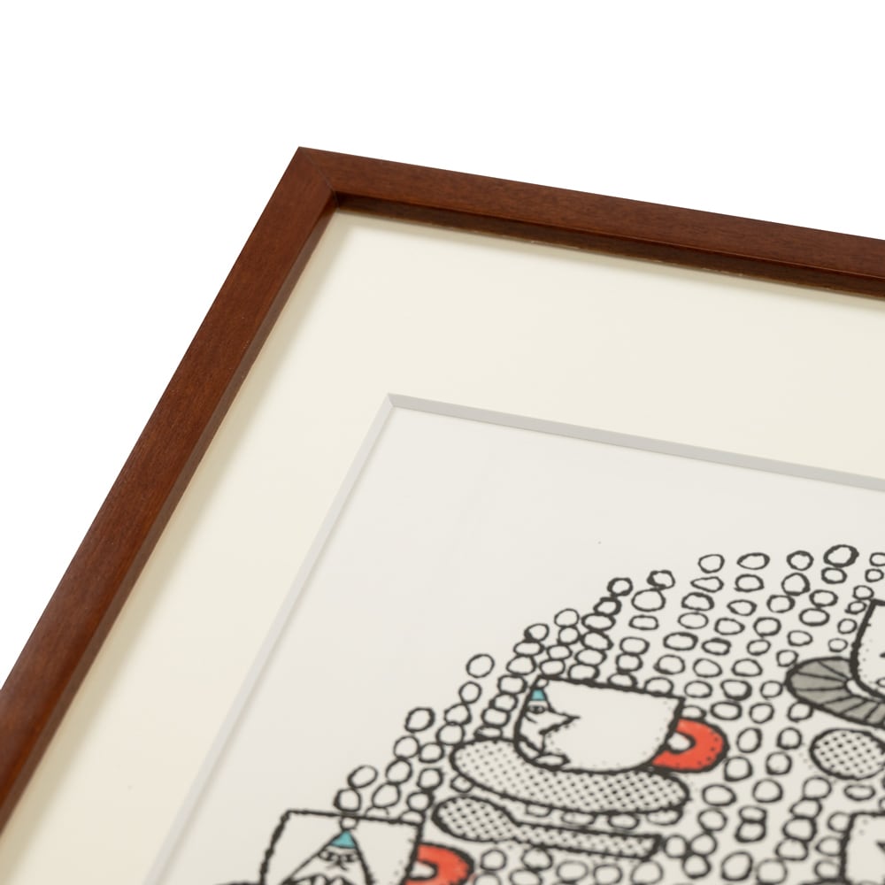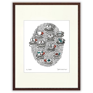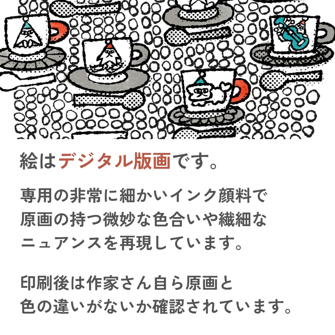 幾重にも並ぶコーヒーカップが、独特のリズム感を生み出すユニークなイラスト作品です。シンプルな線と柔らかな色合いの中に、細やかな模様や遊び心あるモチーフが描かれ、眺めるほどに新しい発見があります。日常的なモチーフでありながら、アートとしての完成度が高く、手に取る人に心地よい余韻を与えます。額縁付きで届くので、購入後すぐにインテリアアートとして楽しめるのも大きな魅力です。