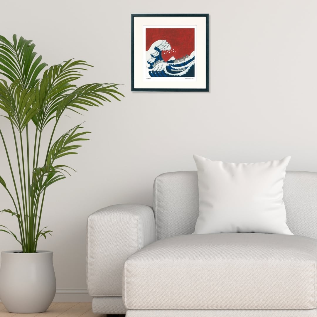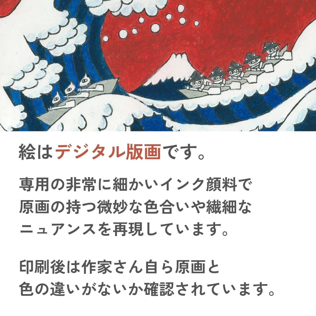 力強い大波とその中に描かれた船、そして背景にそびえる富士山は、葛飾北斎の名作『神奈川沖浪裏』を思わせる迫力ある構図です。深い藍色と赤を基調とした大胆な色使いが、伝統的な浮世絵に現代的なエッセンスを融合させ、独自のアート性を高めています。波間にユーモラスなキャラクターが描かれていることで、見る人の心を和ませながらも圧倒的な存在感を放つイラスト。和とモダンが調和したインテリアアートとして、日常に特別な彩りを添えてくれる作品です。