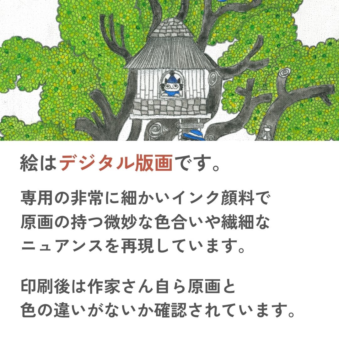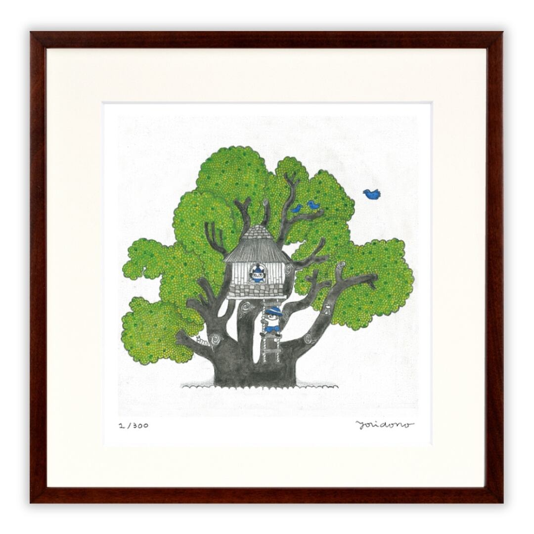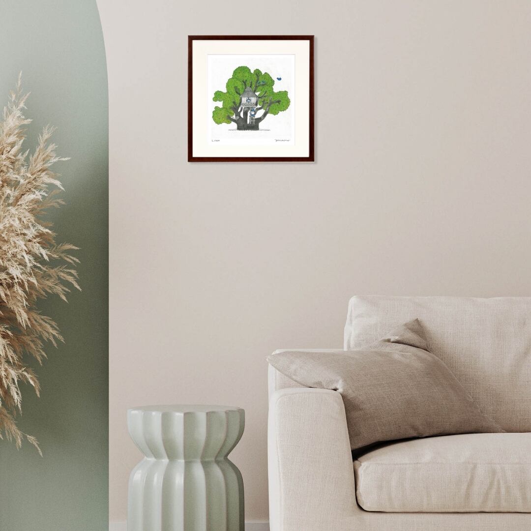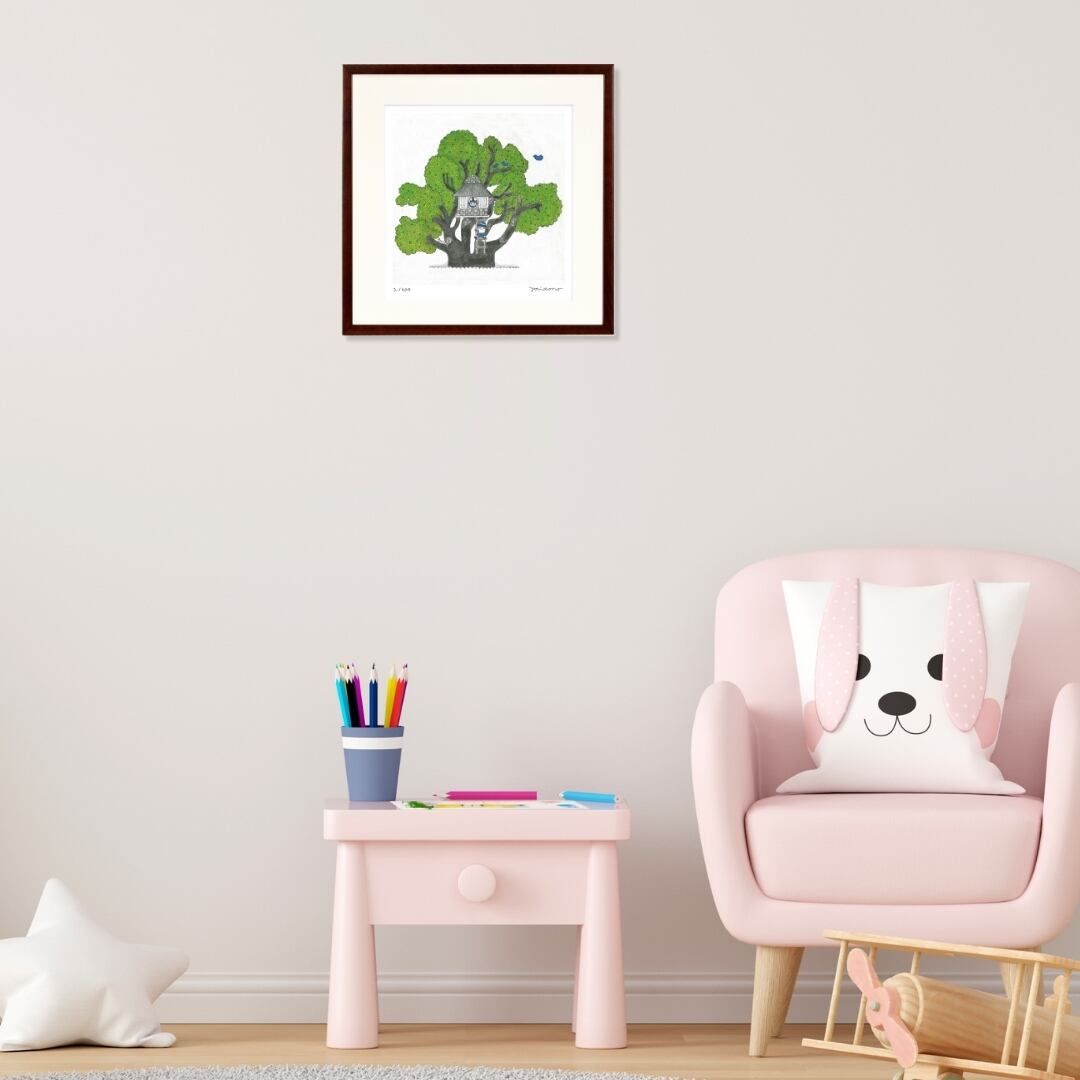 この額縁付きイラストを部屋に飾ることで、自然の豊かさと癒しをインテリアに取り込むことができます。鮮やかなグリーンが視覚的に爽やかさを与え、リビングやワークスペースに落ち着きとリラックス感をプラス。ツリーハウスのモチーフは、童心を思い出させ、見るたびに心が和みます。空間に自然を感じさせるアクセントを取り入れたい方に最適なインテリアアートであり、額縁付きでそのまま飾れる手軽さも魅力です。