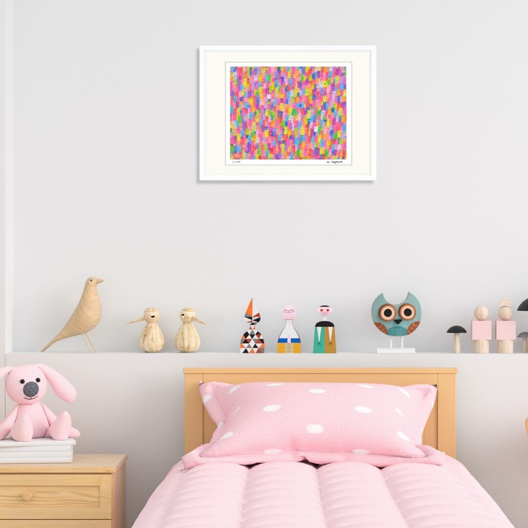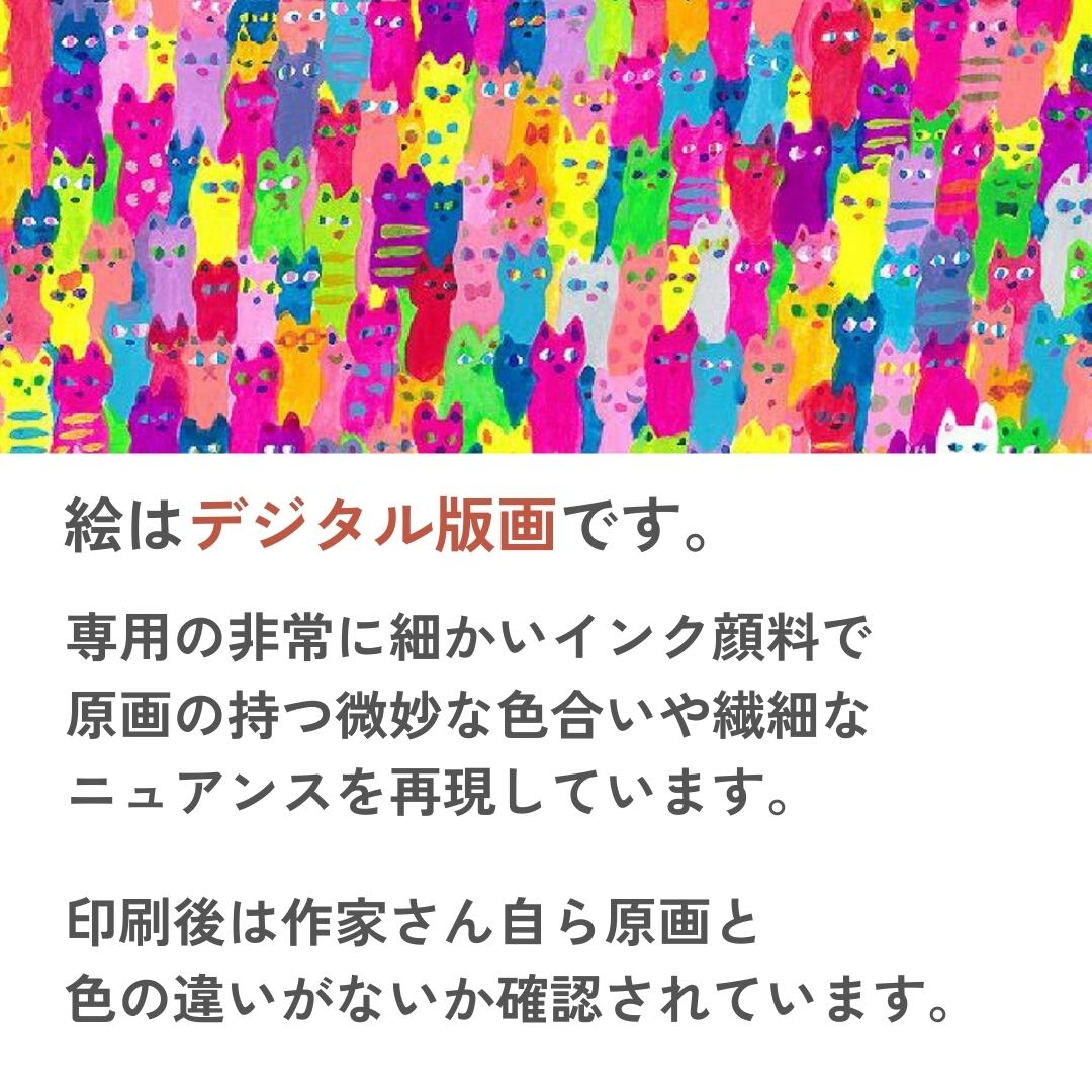 カラフルな猫がぎっしりと並ぶポップで個性的な絵画は、インテリアアートとして強い存在感を放ちます。鮮やかな色合いと猫たちの愛らしい表情は、見る人の気持ちを明るくしてくれるデザインです。壁に飾るだけでお部屋が華やかになり、リビングや子供部屋、玄関など、幅広い空間にマッチします。猫好きの方はもちろん、遊び心のあるアートを探している方にもおすすめです。日常を楽しく彩る猫アートとして、贈り物や自分へのご褒美にもぴったりです。