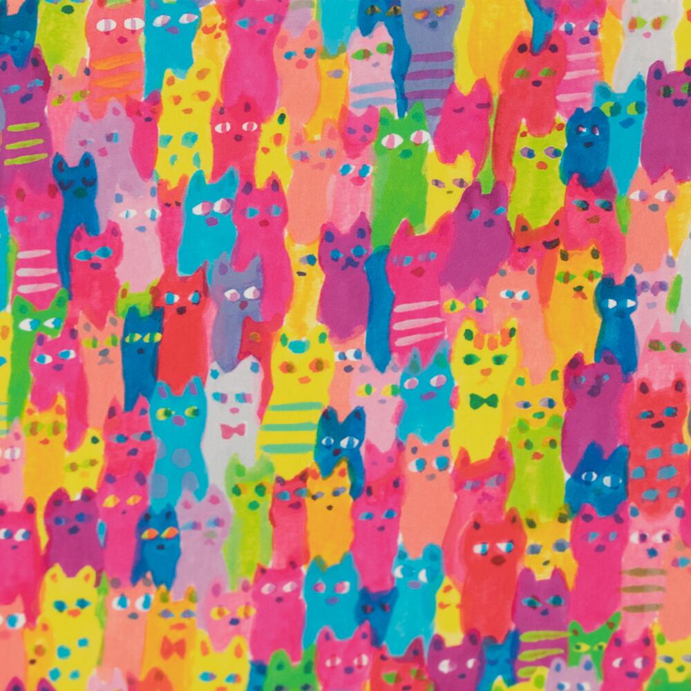 画面いっぱいにカラフルな猫たちが描かれた、楽しい雰囲気あふれる猫アートです。ピンク、ブルー、グリーン、イエローなど鮮やかな色がリズミカルに並び、一見ポップアートのような華やかさを持っています。それぞれの猫は表情や模様が少しずつ異なり、眺めているうちにお気に入りの子を探したくなる遊び心もあります。インテリア絵画として飾ると空間を一気に明るくし、元気を与えてくれる一枚です。かわいらしさとユーモアを兼ね備え、日常に彩りを添えてくれます。