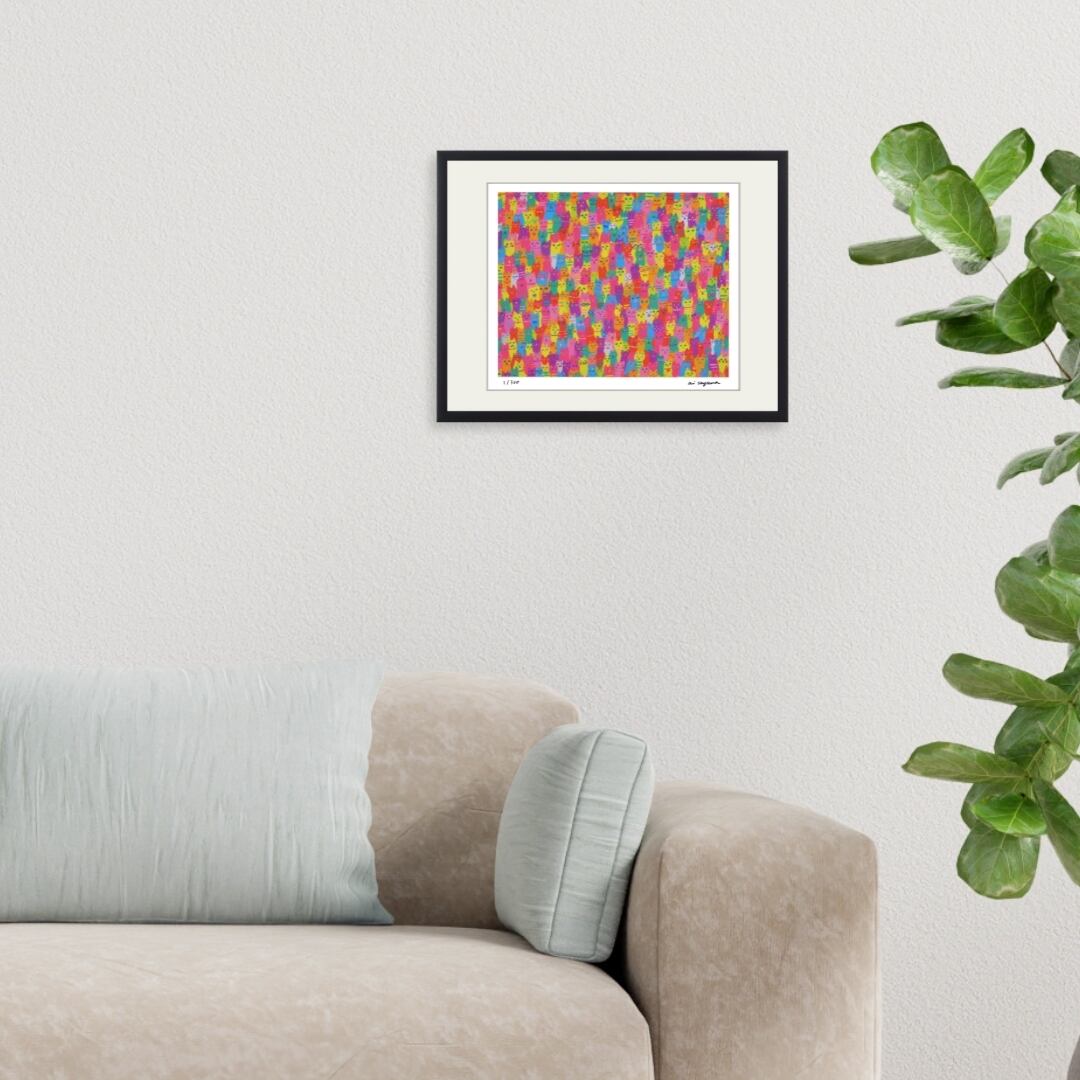 色とりどりの猫たちが並ぶこの作品は、部屋に飾るだけで明るさと遊び心を演出できるアートパネルです。ポップなカラーリングが空間にアクセントを加え、シンプルなインテリアにリズムと活気をもたらします。リビングや子ども部屋、ワークスペースなどに取り入れれば、柔らかなユーモアと活発な雰囲気をプラスできます。猫アートの親しみやすさとモダンな色彩表現が融合し、日常の空間を個性的に彩るインテリアアートとして最適です。