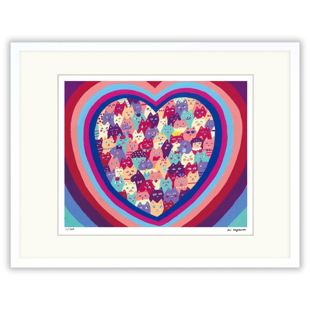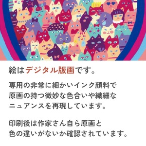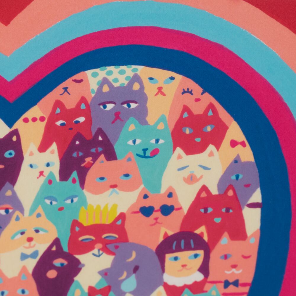 大きなハートの中にたくさんの猫たちが描かれ、色とりどりの表情豊かな世界が広がっています。紫やピンク、青、赤など鮮やかな色彩が重なり合い、まるで愛や幸福感がぎゅっと詰まったような雰囲気を感じさせます。ひとつひとつの猫はそれぞれ異なる個性を持ち、よく見ると王冠をかぶった猫やユーモラスな姿もあり、眺めるたびに新しい発見があります。温かさと楽しさが調和したイラストで、観る人の心をやさしく包み込んでくれるような魅力があります。