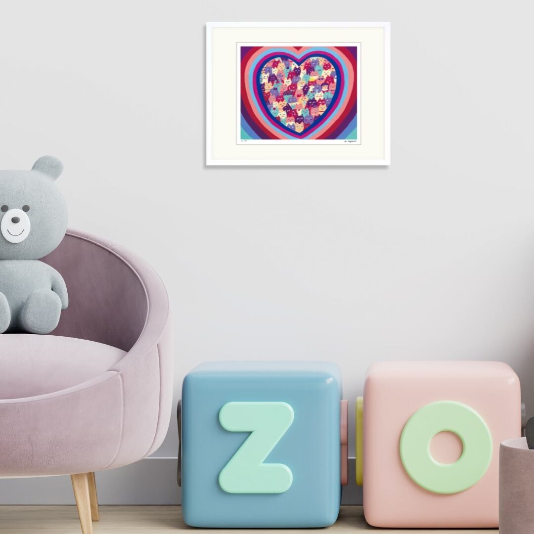 鮮やかな色合いと遊び心にあふれたデザインは、空間に活気と華やかさを加えてくれます。特にリビングや玄関など、人が集まる場所に飾るとポジティブな雰囲気を演出でき、日常に明るさをもたらします。額入りアートとして存在感を放ちながらも、親しみやすさがあるため、幅広いインテリアスタイルに自然になじみます。壁面に取り入れることで空間が一気に生き生きとし、毎日の暮らしを豊かに彩るインテリアアートとして楽しめます。