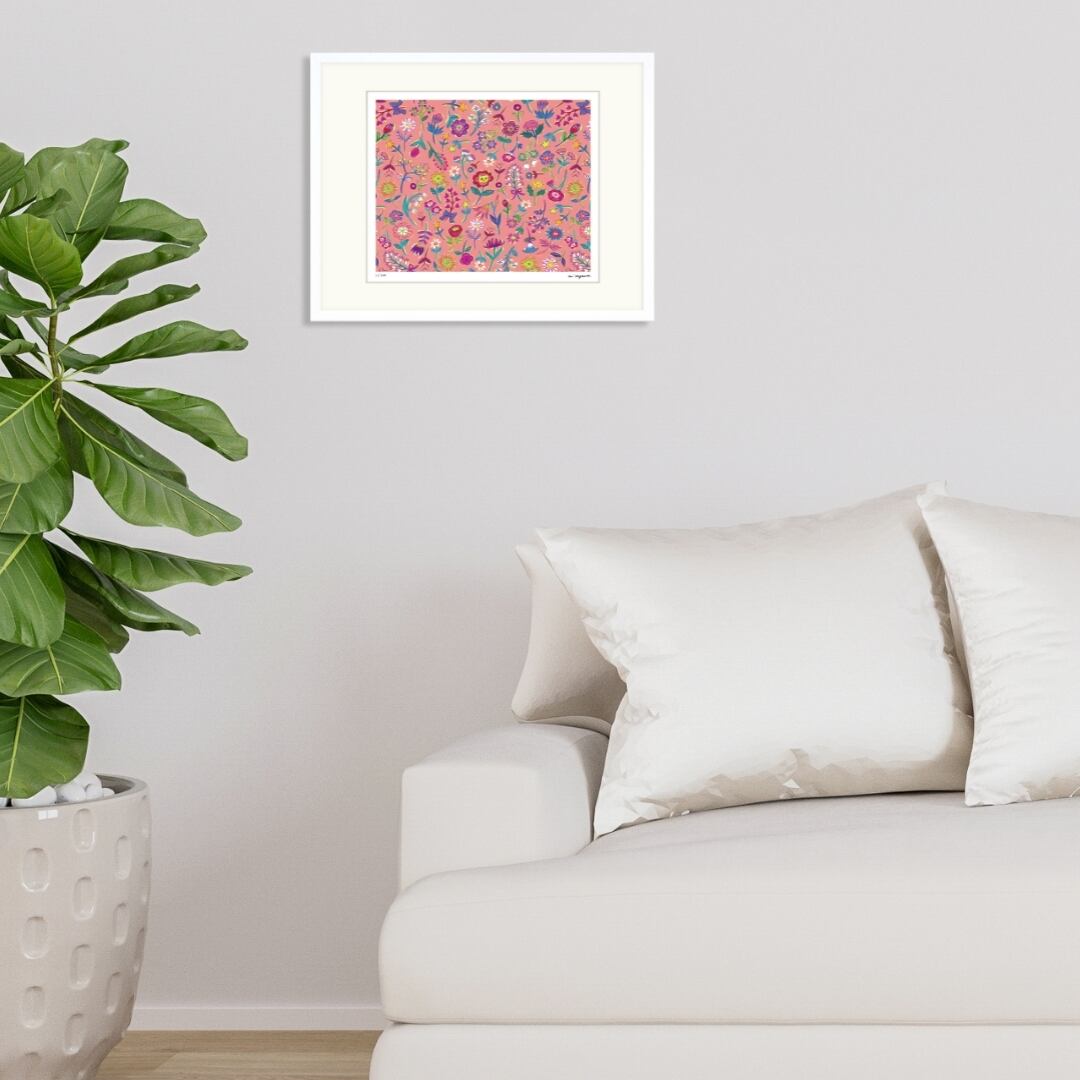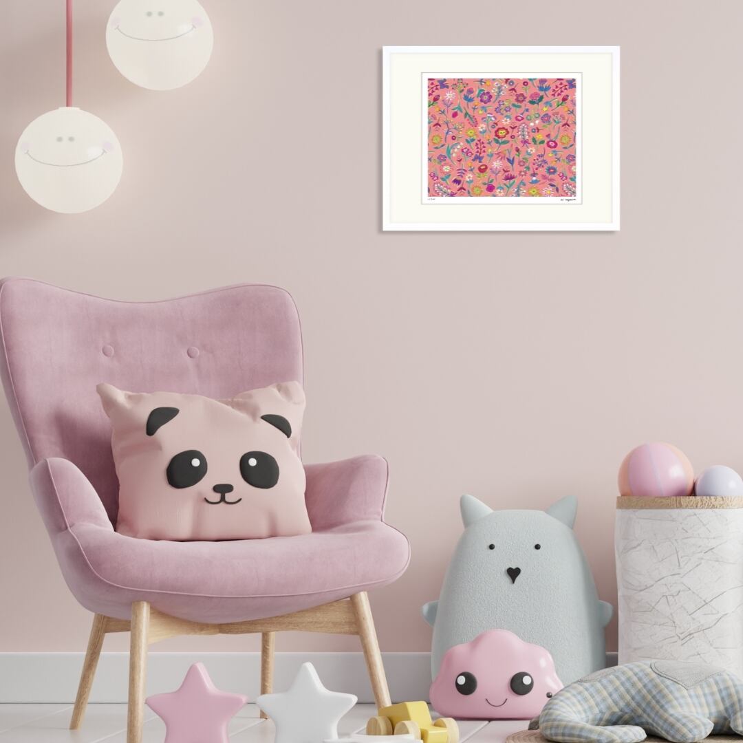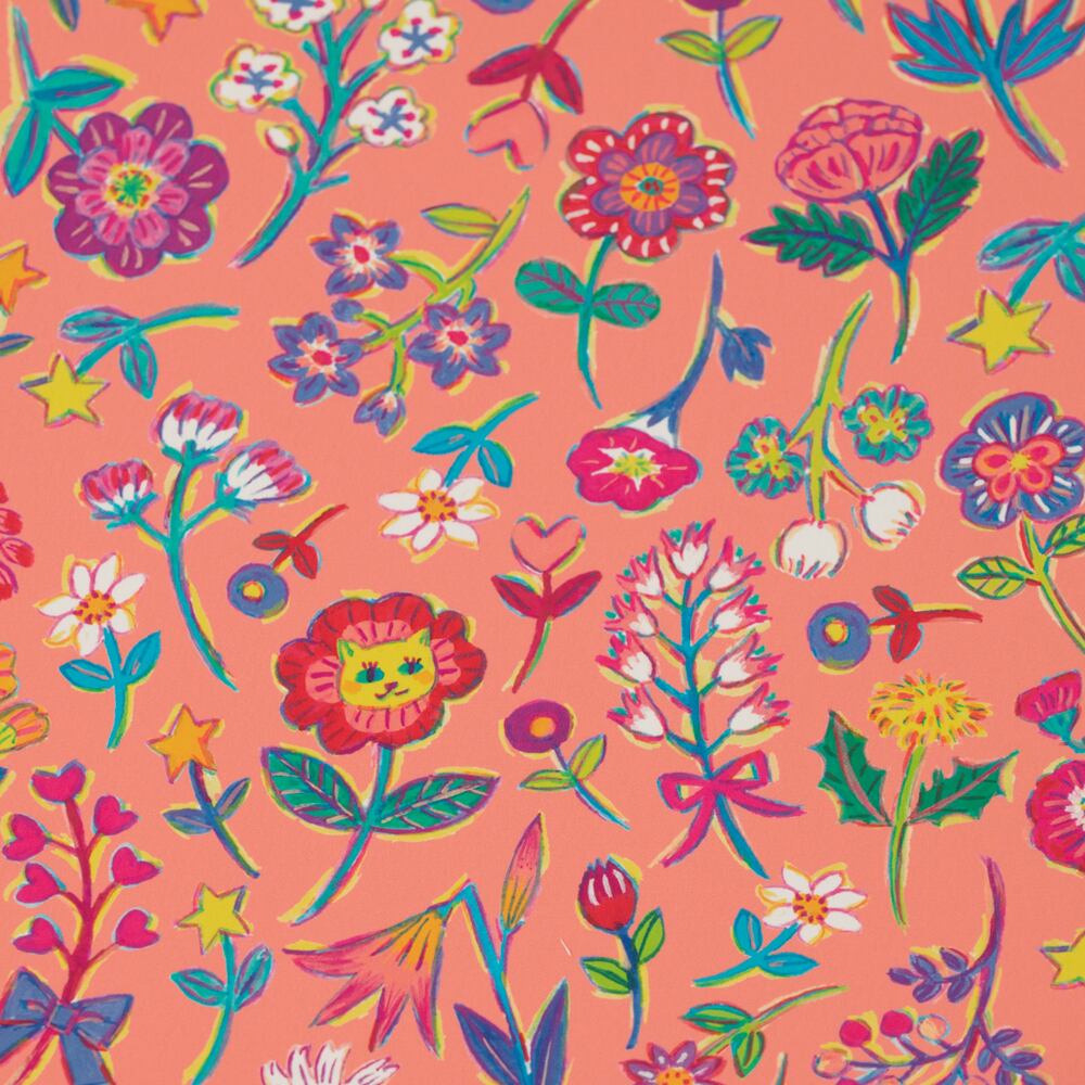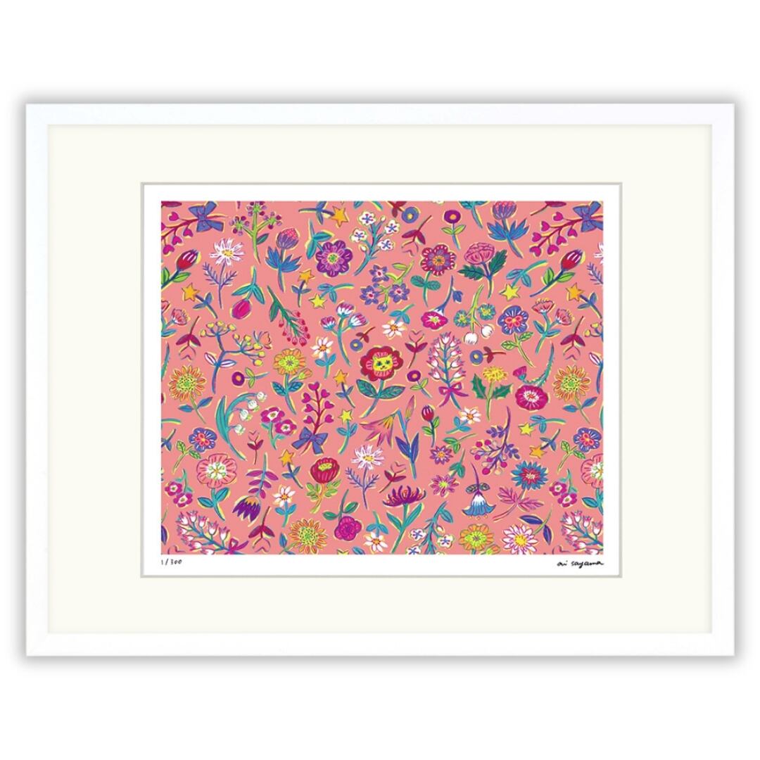 ピンクの背景いっぱいに描かれた色とりどりの花々が、まるで咲き誇る花畑のように画面を埋め尽くしています。よく見ると花の中に愛らしい猫の顔が隠れており、遊び心あふれる仕掛けに思わず笑みがこぼれます。鮮やかな赤や青、黄色などが調和し、明るく軽やかな印象を与えてくれるのが魅力です。花と猫という二つのモチーフが組み合わさることで、鑑賞者に新しい発見と楽しさを届けてくれるアート作品となっています。