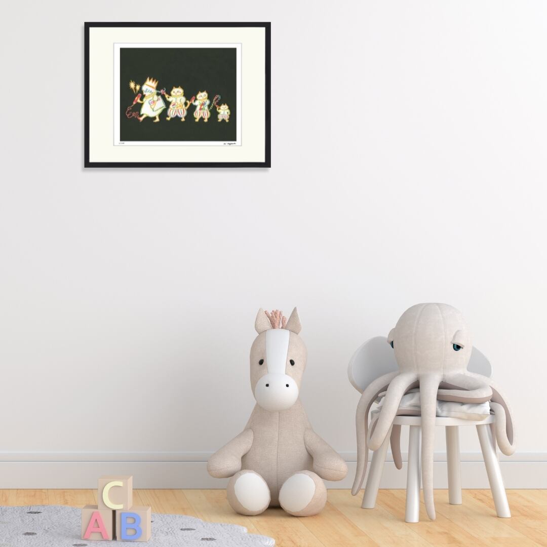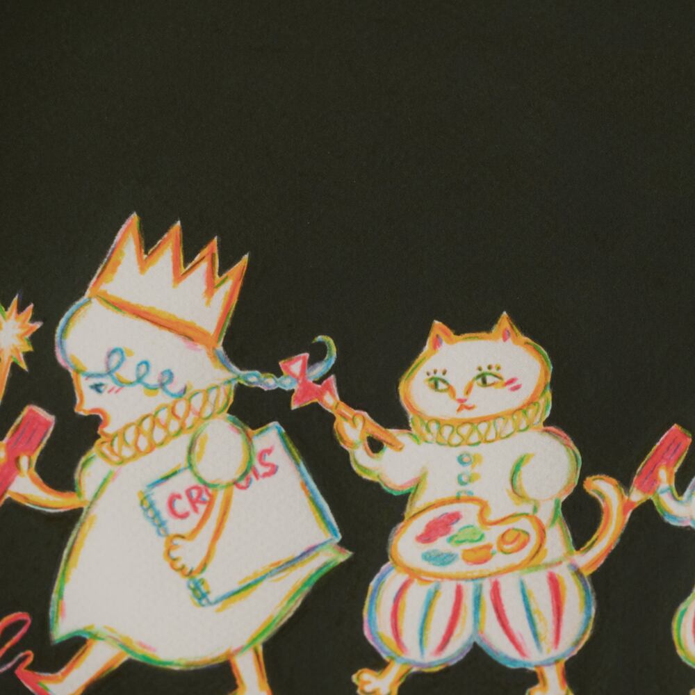 暗い背景に浮かび上がるように描かれた猫たちが、まるで魔法を操る小さな王国の一員のように表現されています。王冠をかぶった存在を先頭に、絵筆やパレット、クラッカーを手にした仲間たちが続く姿は、不思議で愛らしい行進のようです。柔らかなクレヨン調のタッチが温もりを感じさせ、色彩はシンプルでありながらも幻想的な雰囲気を醸し出しています。見ているだけで心が和み、童話の一場面を覗いているような楽しさを味わえるイラストです。