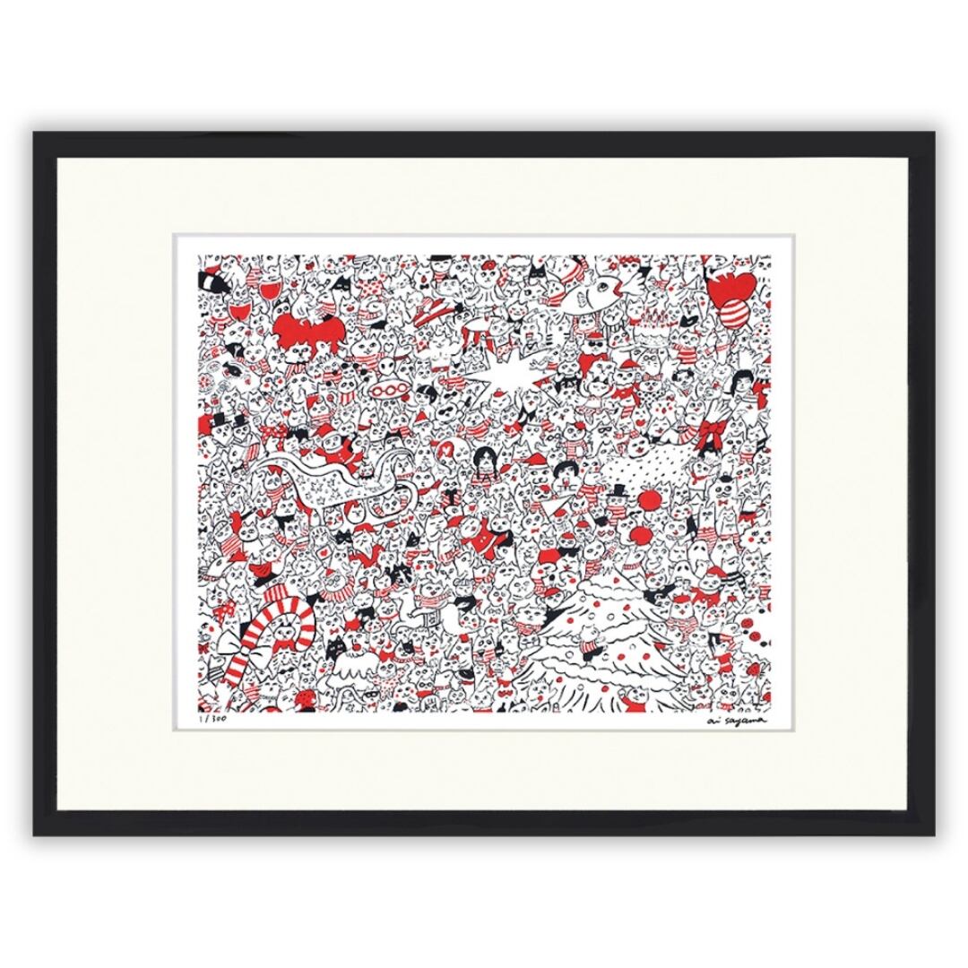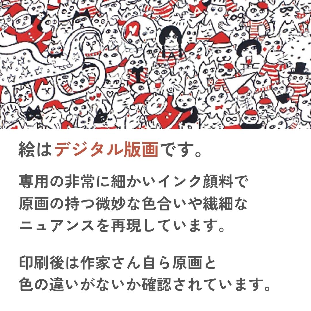白地に赤と黒の二色を基調としたシンプルな配色ながら、無数のキャラクターや猫たち、クリスマスモチーフがひしめき合うように描かれ、賑やかで楽しい雰囲気に満ちた作品です。サンタクロースやツリー、キャンディケーンなど、見るたびに新しい発見がある細やかな描写が特徴で、まるで大人も子どもも楽しめるウォーリーを探せのような感覚を味わえます。ユーモアと華やかさをあわせ持つイラストで、クリスマスの喜びを鮮やかに表現しています。