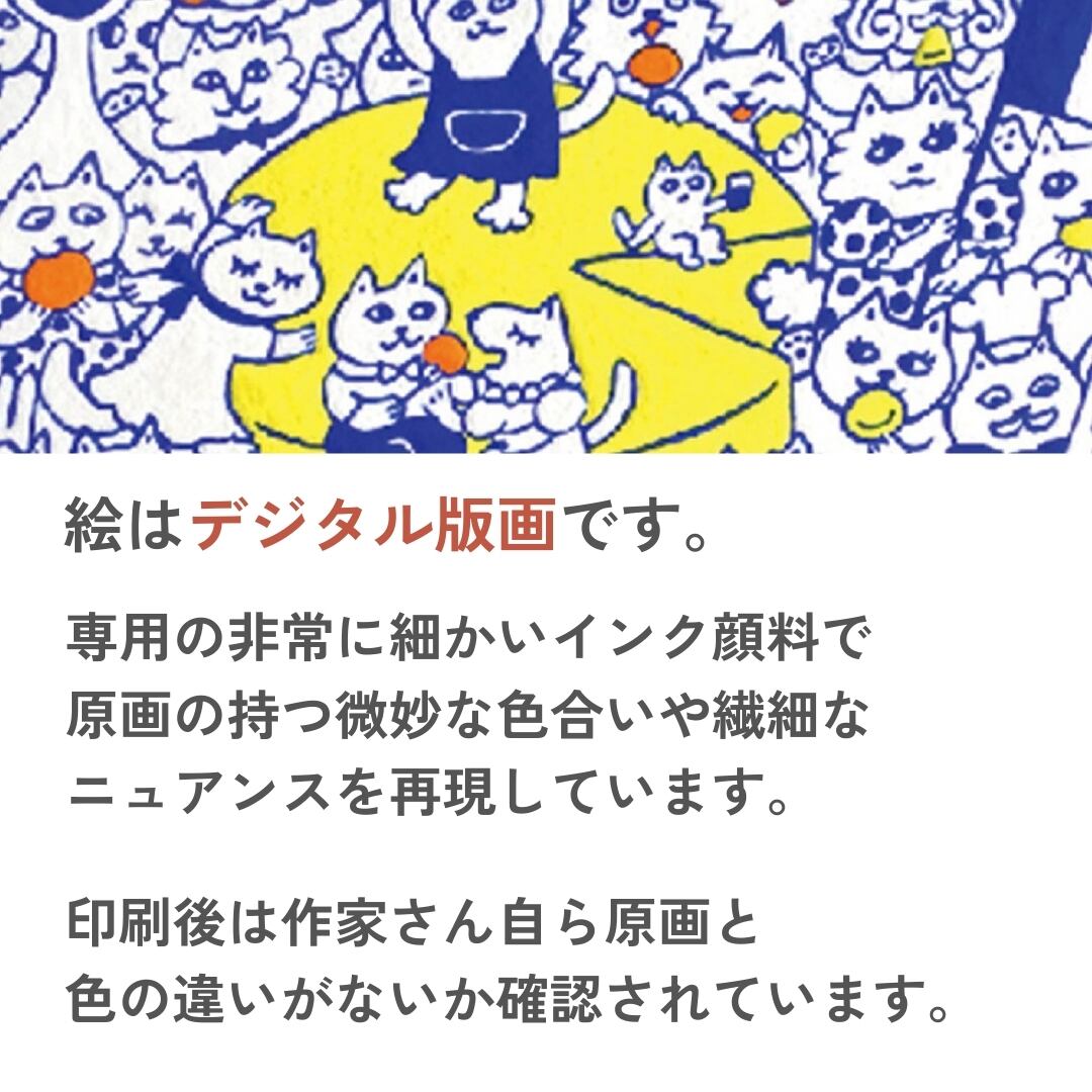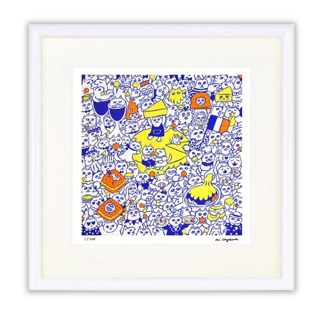 青と黄色を基調とした配色がポップで印象的な作品です。中央には大きなチーズを抱える人物と猫たちが描かれ、周囲にはチーズ料理やワイン、フランスを思わせるモチーフがぎっしりと散りばめられています。細やかな線描と遊び心あふれるキャラクターが織りなす世界は、にぎやかで楽しげな雰囲気に満ちており、眺めるほどに新しい発見があるのが魅力です。大胆な色使いとユーモアが融合したイラストは、観る人に笑顔を届けてくれるでしょう。