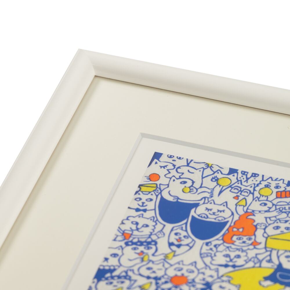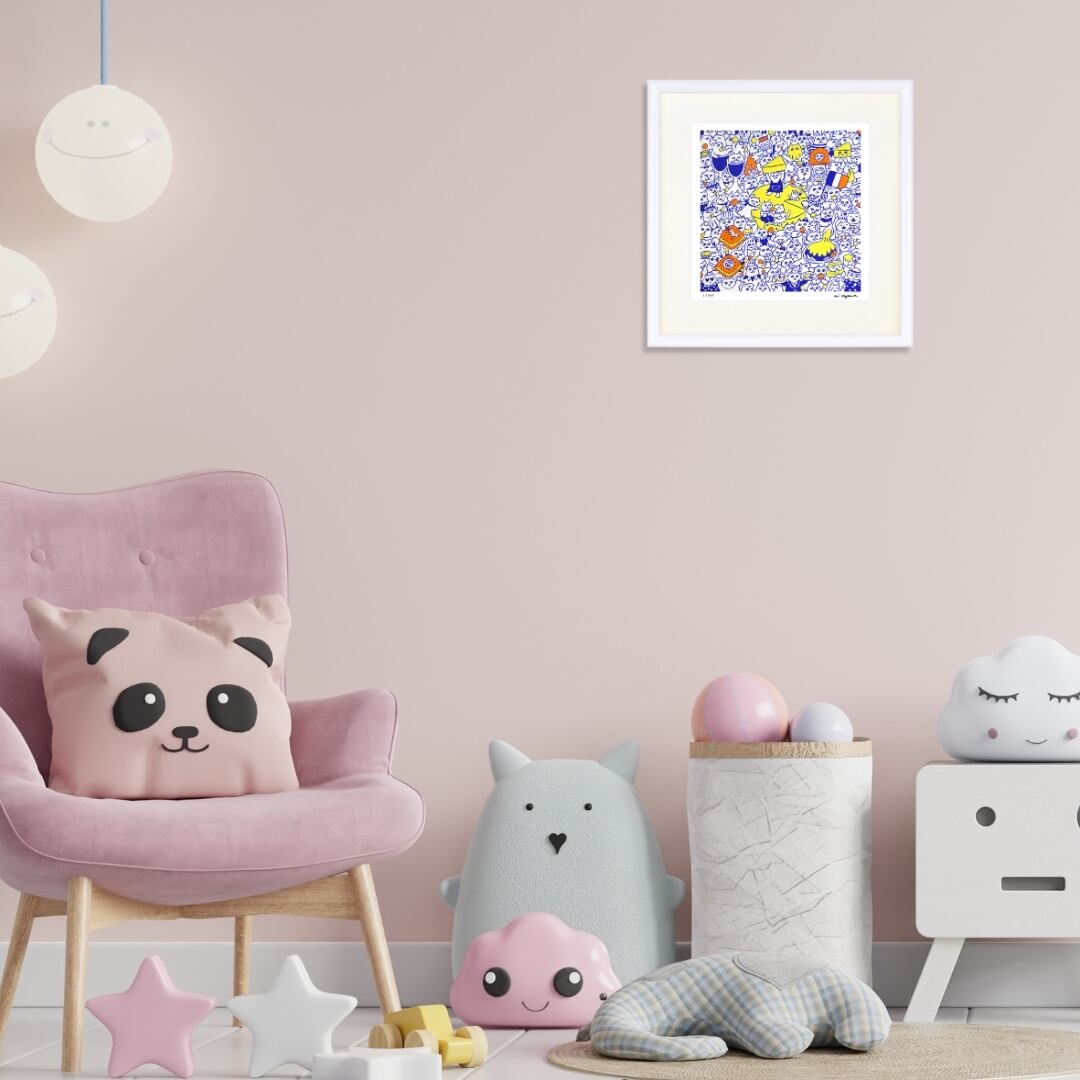 鮮やかなブルーとイエローの組み合わせは、インテリアにモダンで元気な印象を与えてくれます。額入りアートとして壁に取り入れることで、空間にリズムと遊び心が生まれ、明るい雰囲気を演出します。キッチンやダイニングに飾れば食卓をさらに楽しく彩り、リビングではユニークな会話のきっかけにもなるでしょう。シンプルな空間にも映える存在感のあるアートで、毎日の暮らしに軽やかなアクセントを加えることができます。