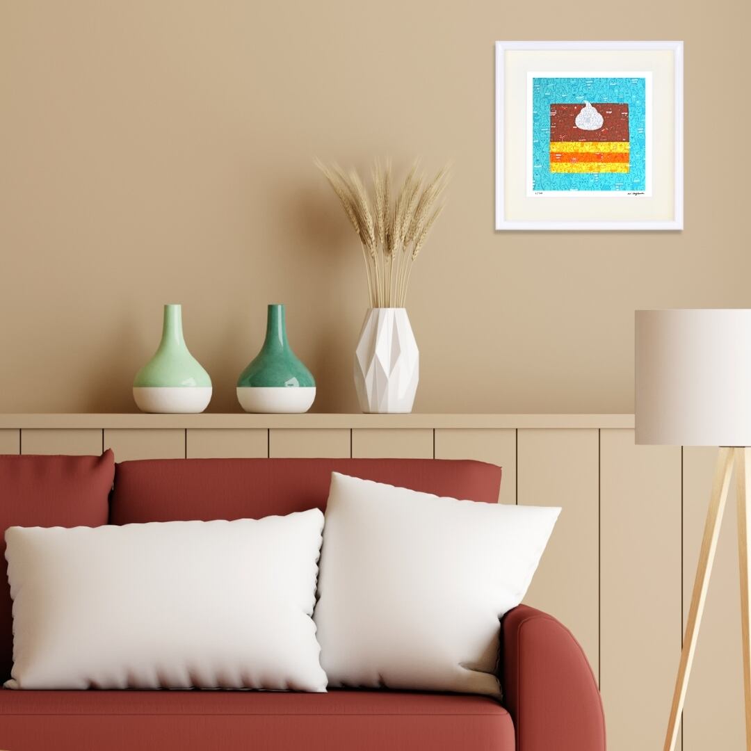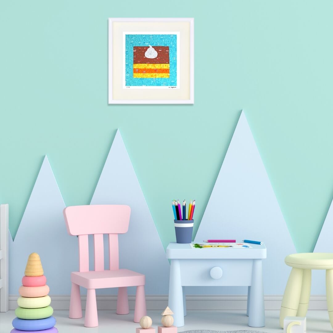 色鮮やかなデザインは、お部屋にポップで明るい雰囲気をプラスしてくれます。額入りアートとして壁に飾ると、カジュアルで親しみやすい印象を演出し、リビングやダイニングを華やかに彩ります。甘いチョコレートケーキのイメージは、食卓やキッチンにもぴったりで、日常に楽しいアクセントを添えてくれるでしょう。アートを通して空間にユーモアと彩りを加えることで、暮らしの中に心地よい遊び心を取り入れることができます。