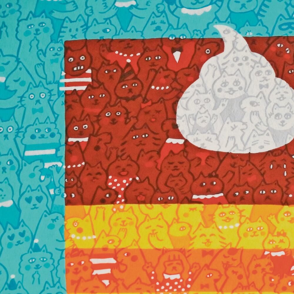 カラフルな猫たちが集まり、チョコレートケーキの形を描き出したユニークな作品です。青やオレンジ、ブラウンなどの鮮やかな色が層のように重なり、中央のホイップクリームが際立つデザインになっています。よく見ると一匹一匹の猫たちが愛らしい表情で描かれており、遊び心あふれる構成に心が弾みます。シンプルなモチーフでありながら、細部にまで施された表現が独特の魅力を放ち、観る人を楽しませてくれるイラスト作品です。
