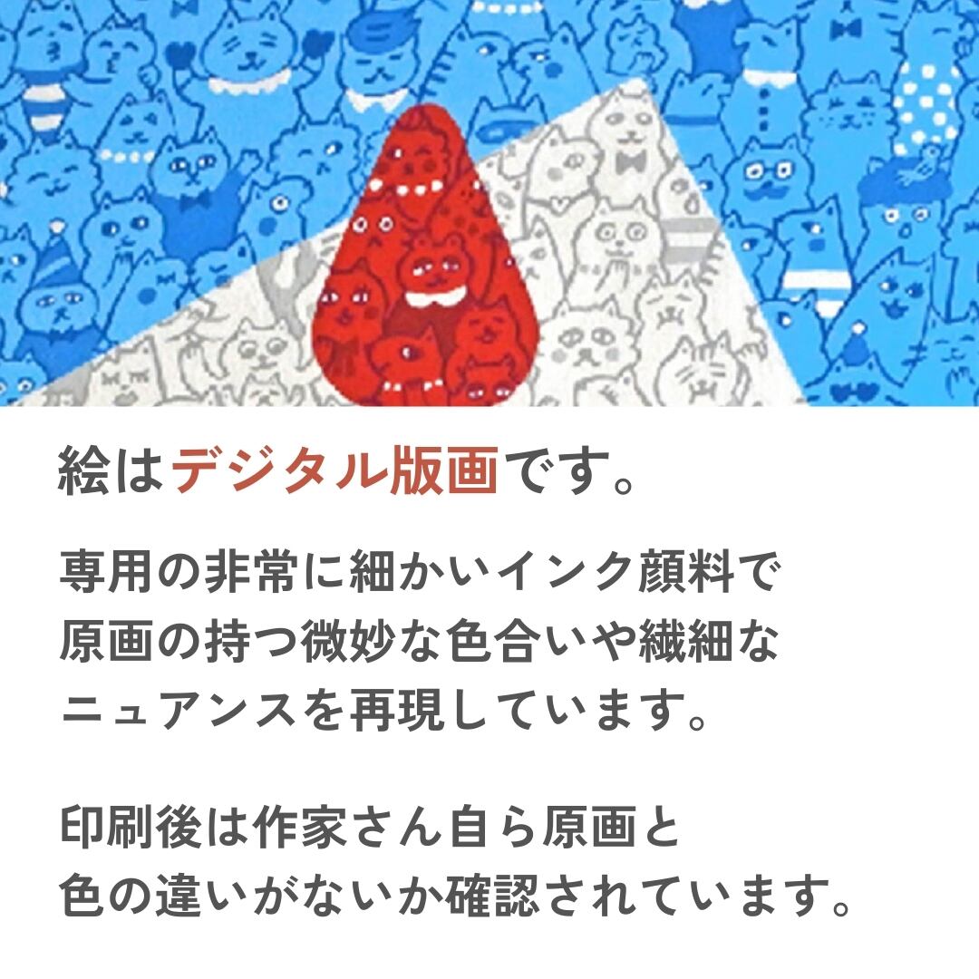 鮮やかな色合いで描かれたショートケーキをモチーフにした作品です。背景のブルーに無数の猫が並び、ケーキのスポンジ部分やクリーム、いちごもまた愛らしい猫たちによって構成されています。黄色やピンクの層が重なり、中央の赤いいちごがアクセントとなって、明るく楽しい雰囲気を漂わせます。単なるスイーツの絵にとどまらず、細やかな表情や模様を持つ猫たちが全体に命を吹き込み、眺めるほどに発見があるユニークなアートです。