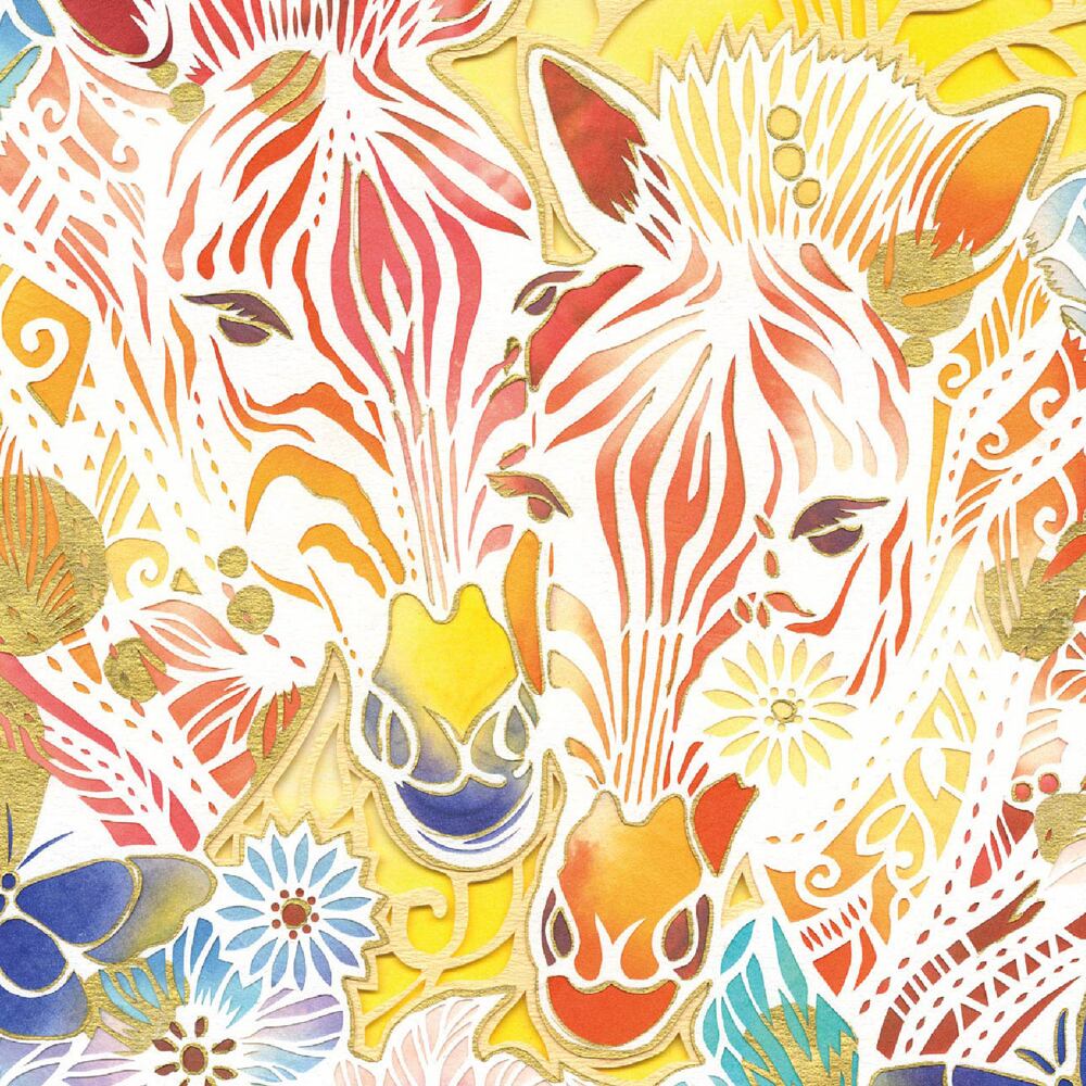 「花とシマウマ」は、鮮やかな色彩と緻密な表現が際立つ作品です。本来は白と黒の縞を持つシマウマが、赤や青、黄色など多彩な花々に囲まれることで、力強さと優美さを同時に描き出しています。縞模様のリズムが花々の華やかな曲線と響き合い、画面全体に生き生きとした調和が広がります。鮮烈な色使いながらも繊細で透明感のある表現は、観る人の心を惹きつけ、自然が持つ生命の輝きを鮮明に伝えてくれる一枚です。