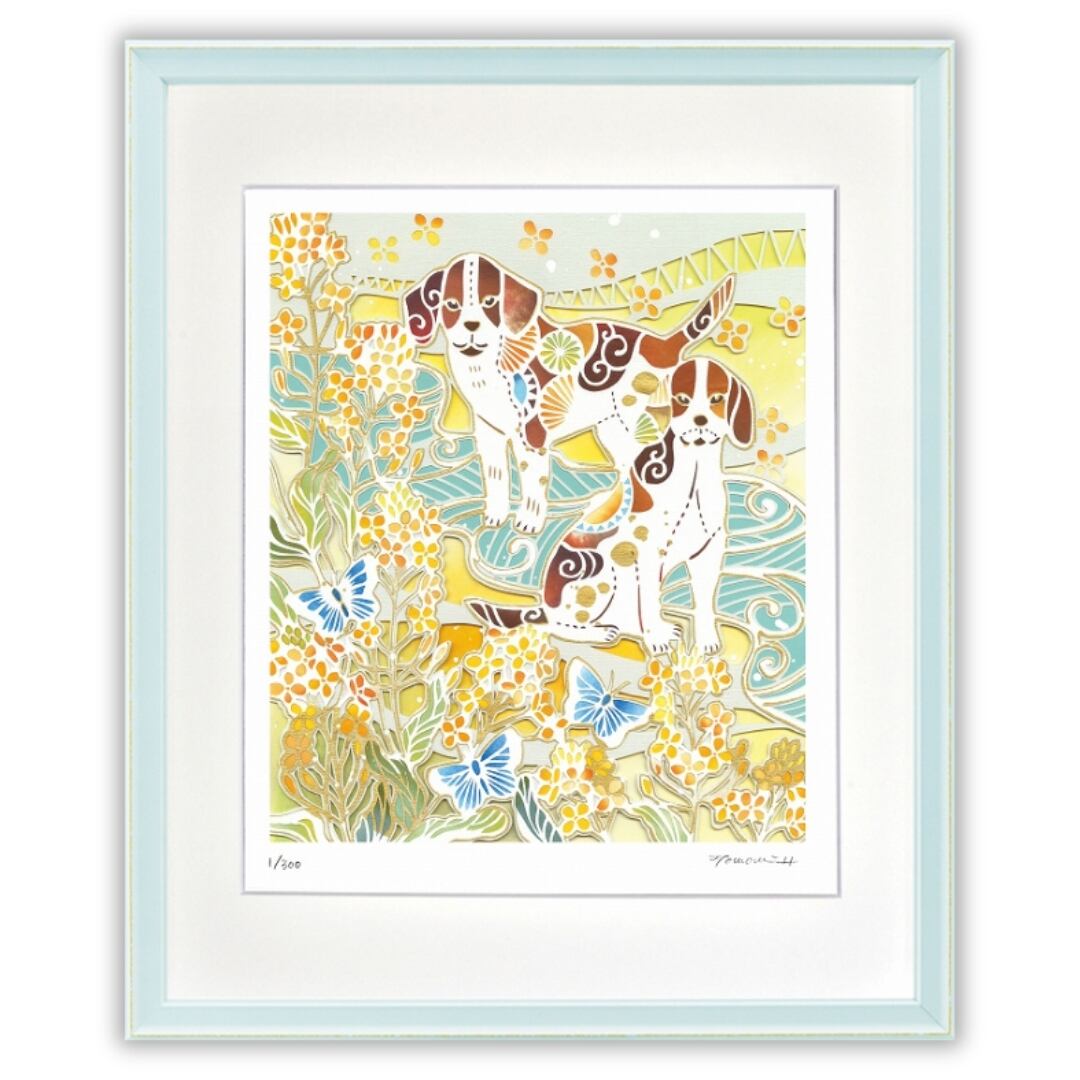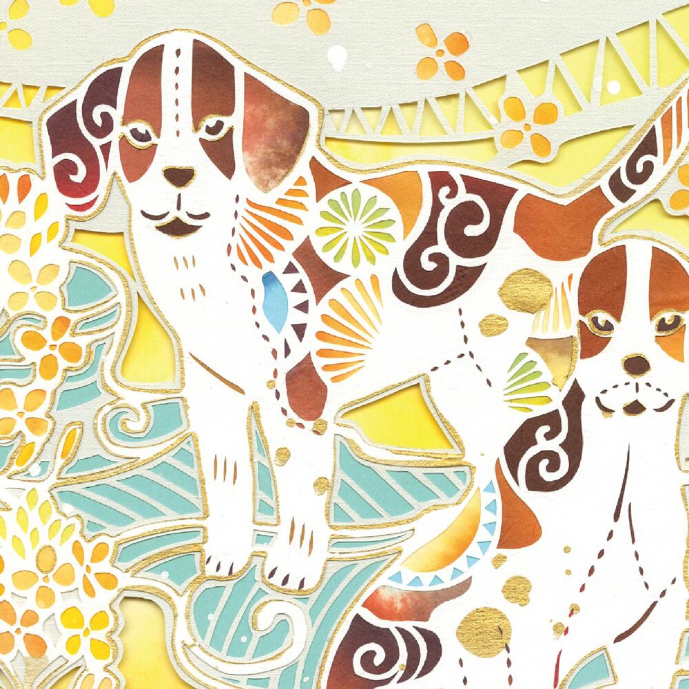 可愛らしい二匹の犬が春の花々の中で遊ぶ様子が、鮮やかな色彩と切り絵の繊細な技法で表現されています。黄色やオレンジを基調とした花々が咲き誇り、その間を舞う青い蝶が画面に軽やかな動きを添えています。犬の模様には和の文様があしらわれ、伝統美とモダンなデザインが融合した独特の世界観を醸し出しています。背景の柔らかな空色や流れるような線描が全体に調和をもたらし、見る人に温かく爽やかな季節の息吹を感じさせる作品となっています。