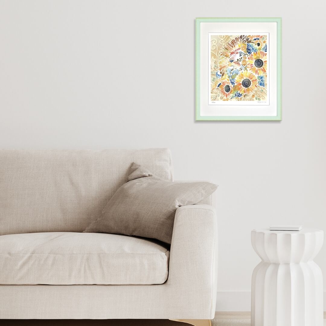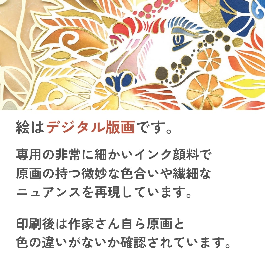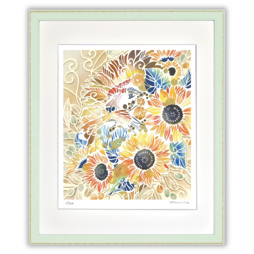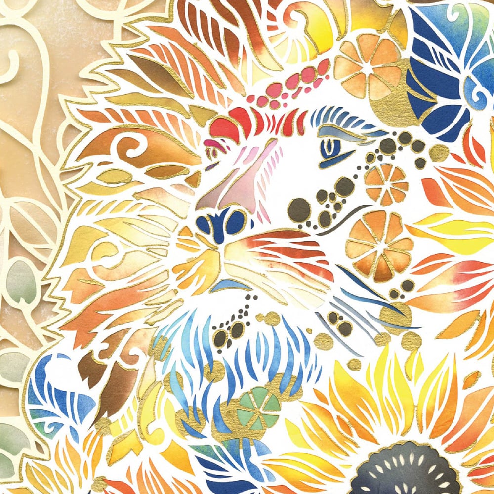ひまわりの鮮やかな黄色と橙が画面いっぱいに広がり、その中央から堂々たるライオンが姿を現します。まるで花々がたてがみと一体化したように構成され、自然と動物が調和する大胆な世界観を生み出しています。青や緑の差し色が夏の空や大地の清涼感を思わせ、黄金色の装飾が光を浴びたような輝きを放ちます。切り絵ならではのシャープで緻密な線と透けるような彩色が重なり合い、力強さと華やかさを同時に感じさせる、まさに夏を象徴する一枚です。