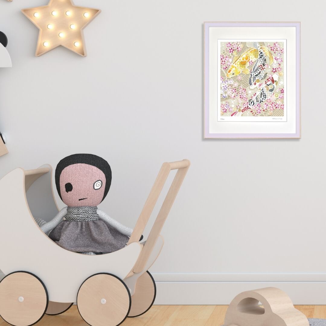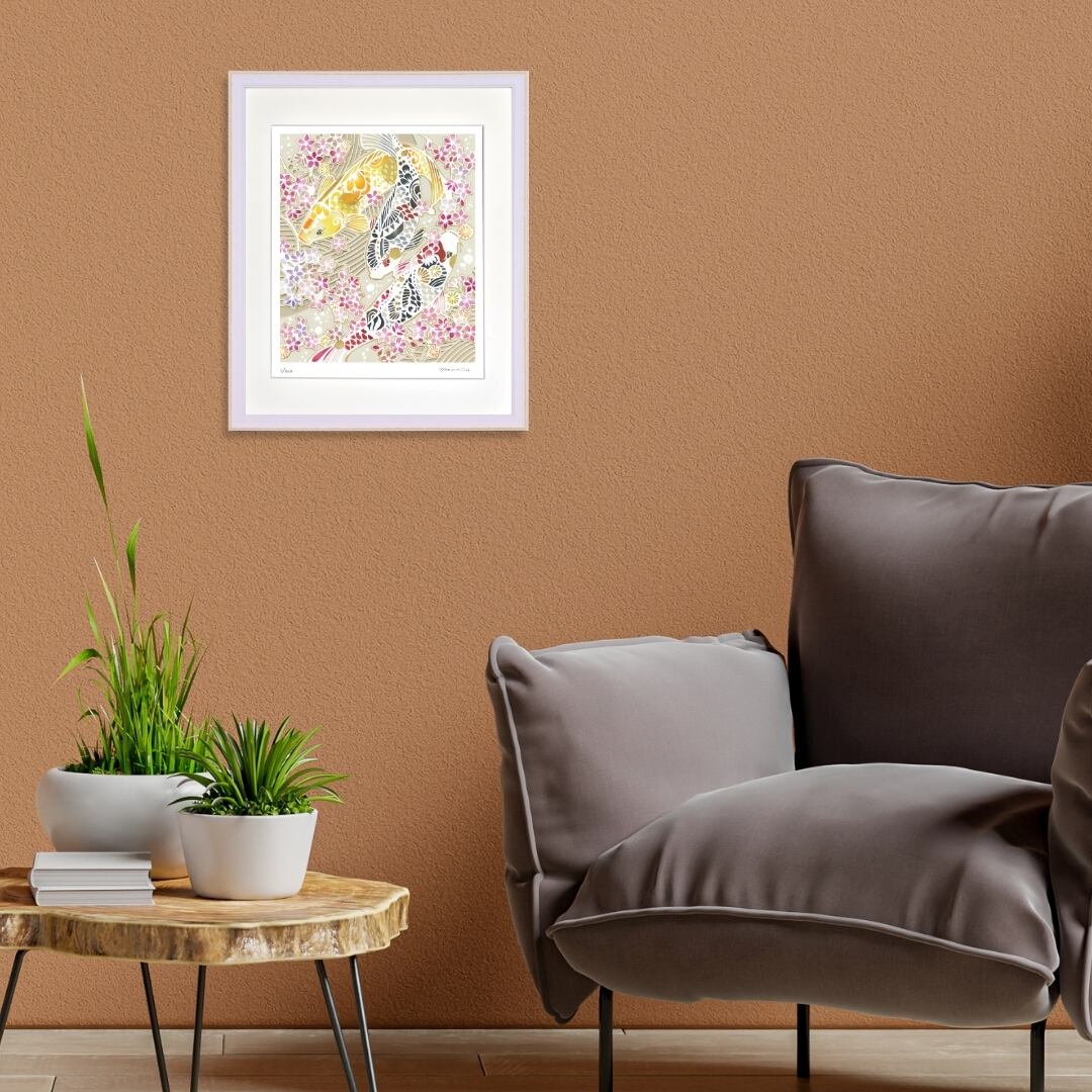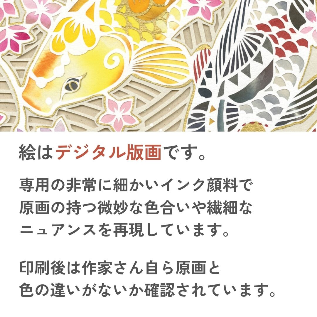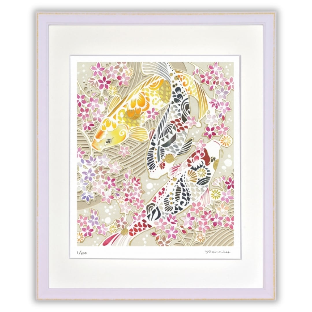 この作品は、室内に春の訪れを告げるような明るさと爽やかさをもたらします。桜の華やかな色彩は新たな始まりや希望を象徴し、錦鯉の力強い泳ぎは繁栄や前進のイメージを重ねます。眺めることで自然と心が晴れやかになり、日々に活力を与えてくれるでしょう。切り絵の立体感は光によって表情を変え、時間の移ろいとともに春の情景をより深く楽しむことができます。季節の彩りを室内に取り込む一枚です。