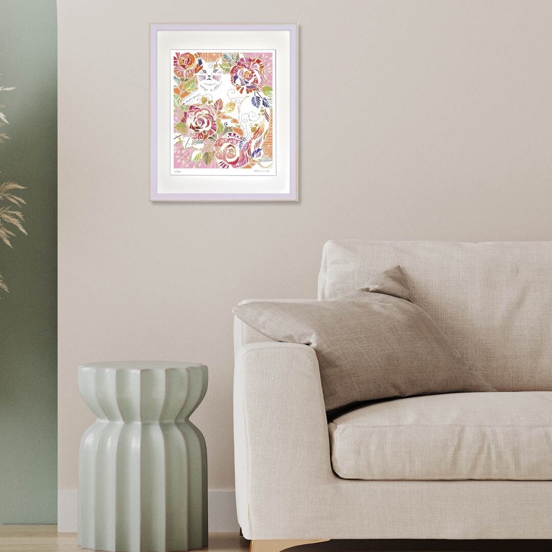 バラと猫というモチーフの組み合わせは、華麗さと愛らしさを同時に感じさせ、空間に気品と温かみをもたらします。彩り豊かな花々が視界を明るく彩り、眺めるたびに日常を華やかにしてくれるでしょう。猫の落ち着いた表情は心を和ませ、見る人に安らぎを与えます。華やぎと癒しを兼ね備えた存在感ある一枚として、暮らしに長く寄り添う魅力を持っています。