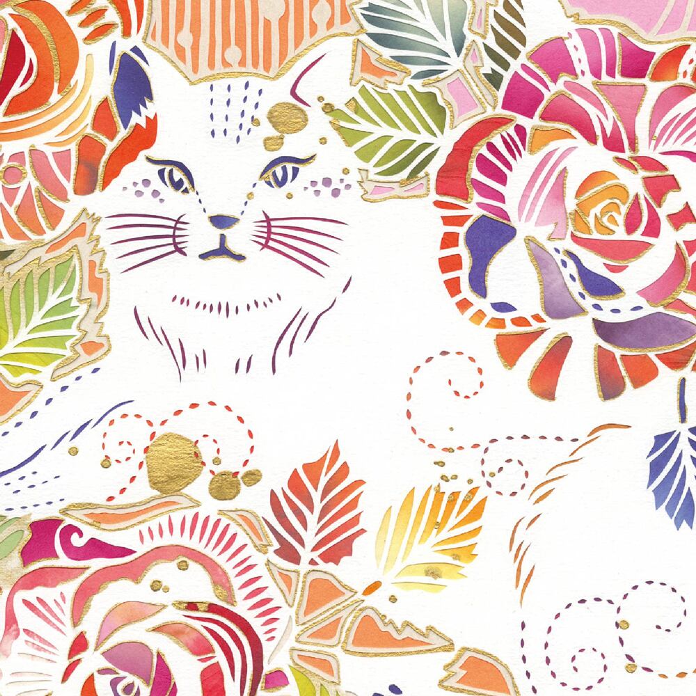 華やかなバラに包まれるように描かれた猫が印象的な一枚です。ピンクを基調とした背景に赤や紫、オレンジの花々が咲き誇り、画面全体に優雅さと生命力を与えています。切り絵ならではの緻密なラインが花びらのひとひらまでを繊細に描き出し、毛並みにも柔らかな表情を添えています。猫の静かな眼差しと花々の豊かな彩りが響き合い、静と動のコントラストが心に残る作品です。