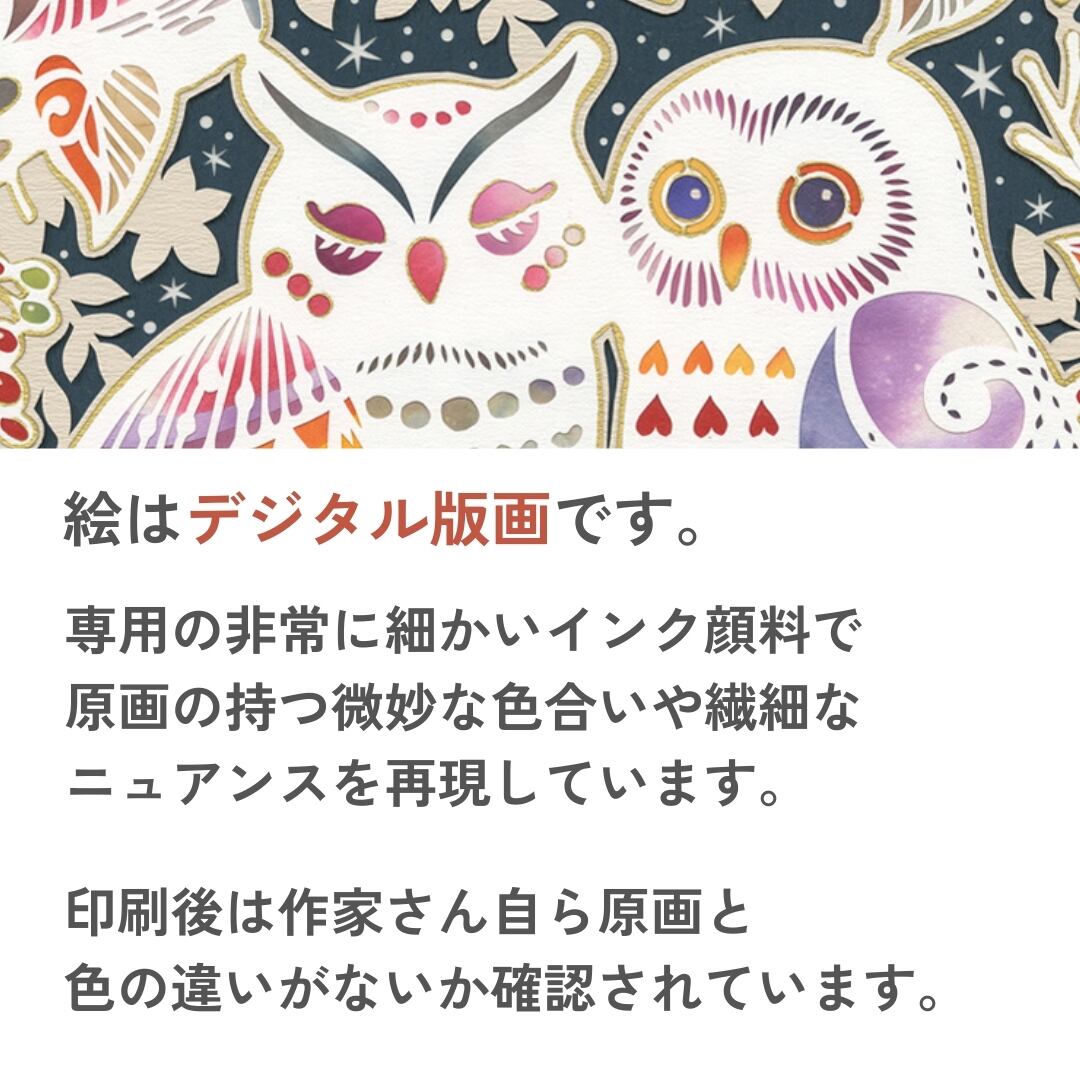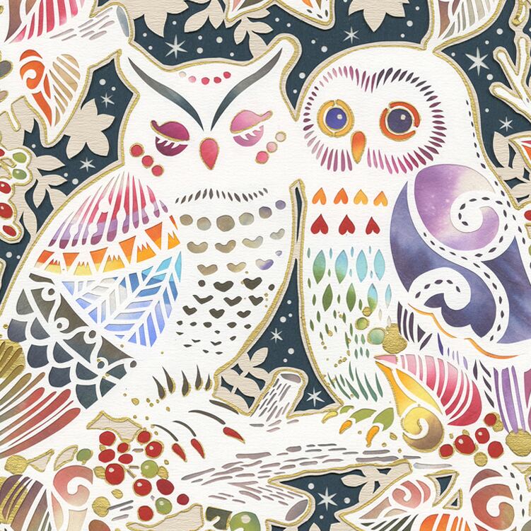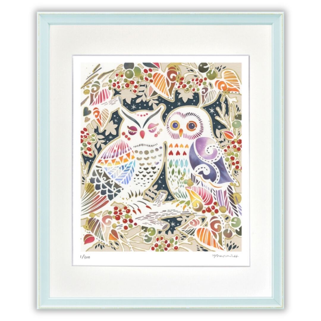 寄り添う二羽のフクロウが描かれた作品は、深い夜の森を背景に、冬を迎える静かな気配を伝えています。赤い実をつけた枝葉が画面を彩り、寒さの中にも生命力を感じさせます。フクロウの羽根には幾何学的で華やかな模様が施され、幻想的な光を帯びたように輝きます。漆黒の夜空に浮かぶ星々と、豊かな装飾の羽模様が響き合い、冬の森の神秘を美しく表現しています。観る者に深い安らぎと包容力を感じさせる一枚です。