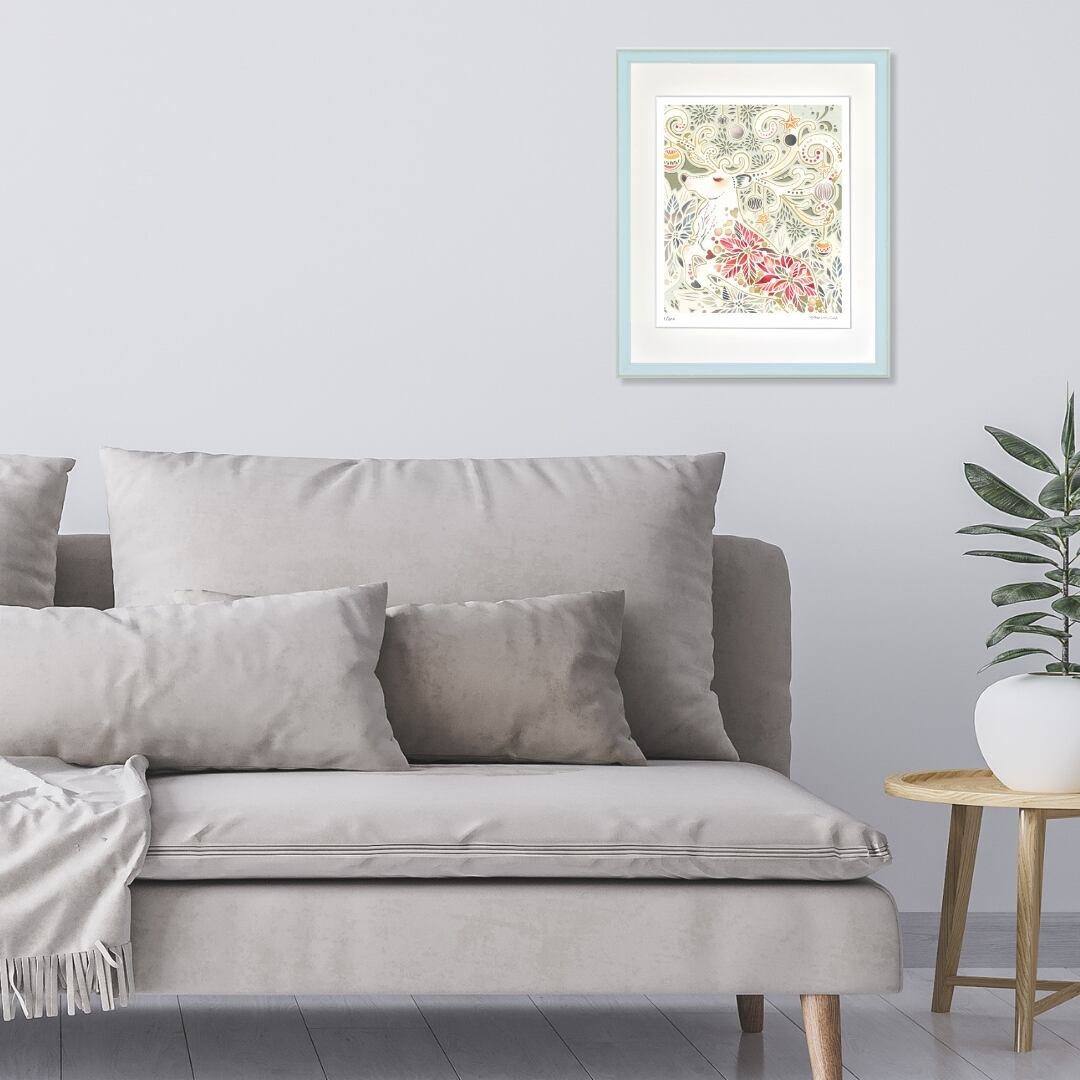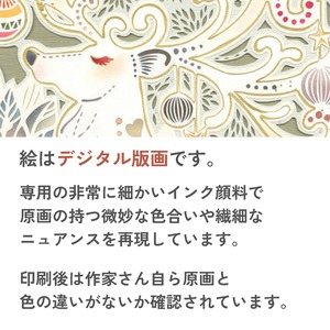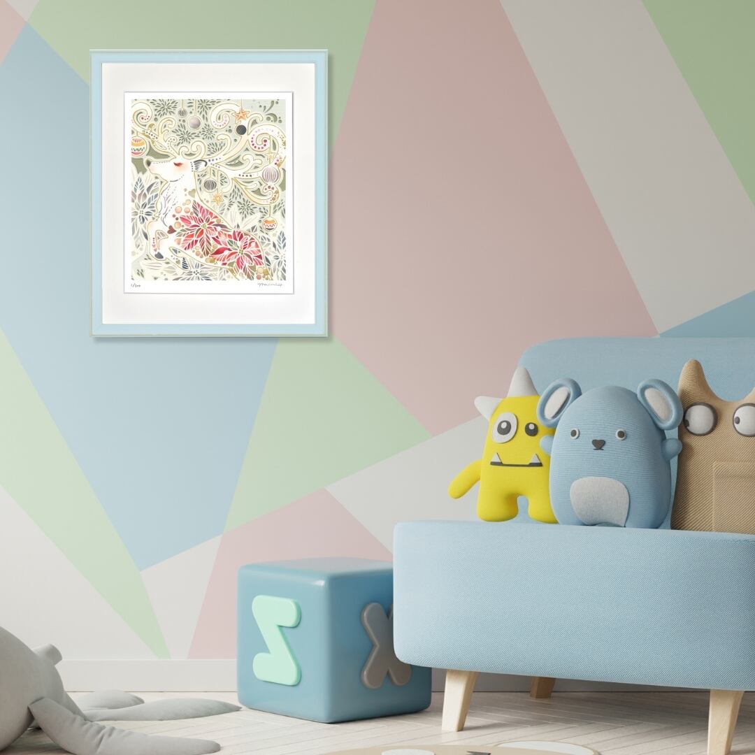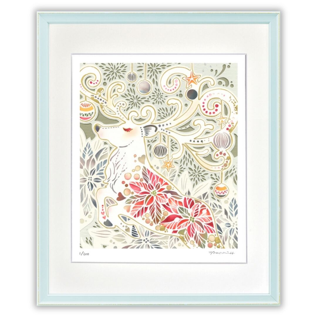 この作品は、クリスマスシーズンの雰囲気を一層盛り上げてくれます。鮮やかな赤や金色の装飾が、空間に温かみと華やかさを添え、心を弾ませるような印象を与えます。鹿の穏やかな表情は安らぎをもたらし、見る人に幸福感や安心感を届けてくれるでしょう。冬の特別なひとときを彩り、家族や大切な人との時間をより豊かにしてくれる、まさに祝祭の象徴ともいえる一枚です。