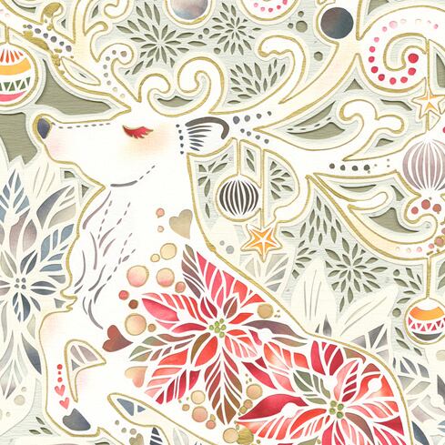 優雅に佇む鹿の姿が、まるでクリスマスの精霊のように表現されています。身体を彩る赤いポインセチアは、冬の花として季節を象徴し、温かな彩りを添えています。枝のように広がる角には、星やオーナメントが煌めき、まるで夜空に輝くイルミネーションのような華やぎを感じさせます。背景の柔らかな色調と細やかな模様は、冬の静けさの中にある特別な喜びを伝え、観る者の心を温めるようです。祝祭の幻想的なひとときを切り取ったような、華やかで夢のある作品です。