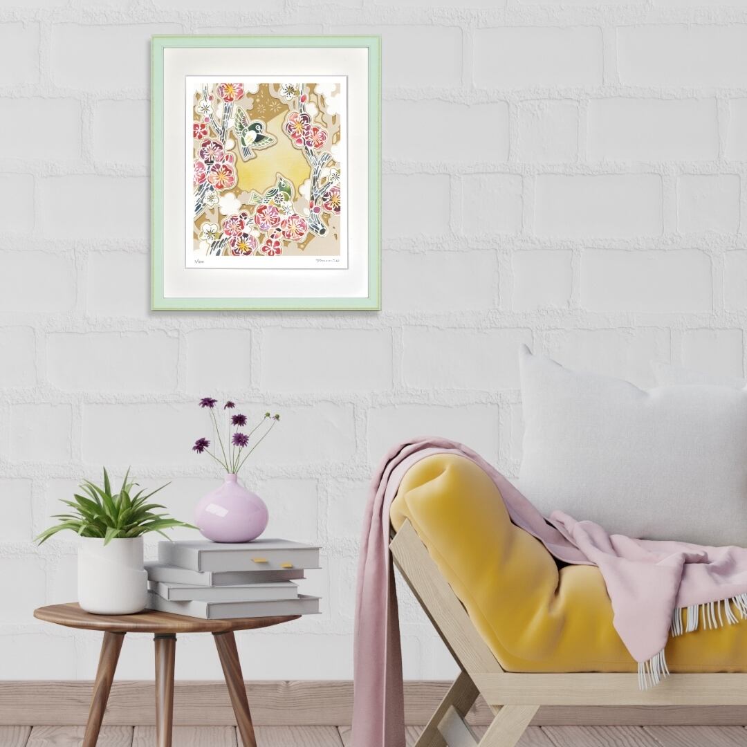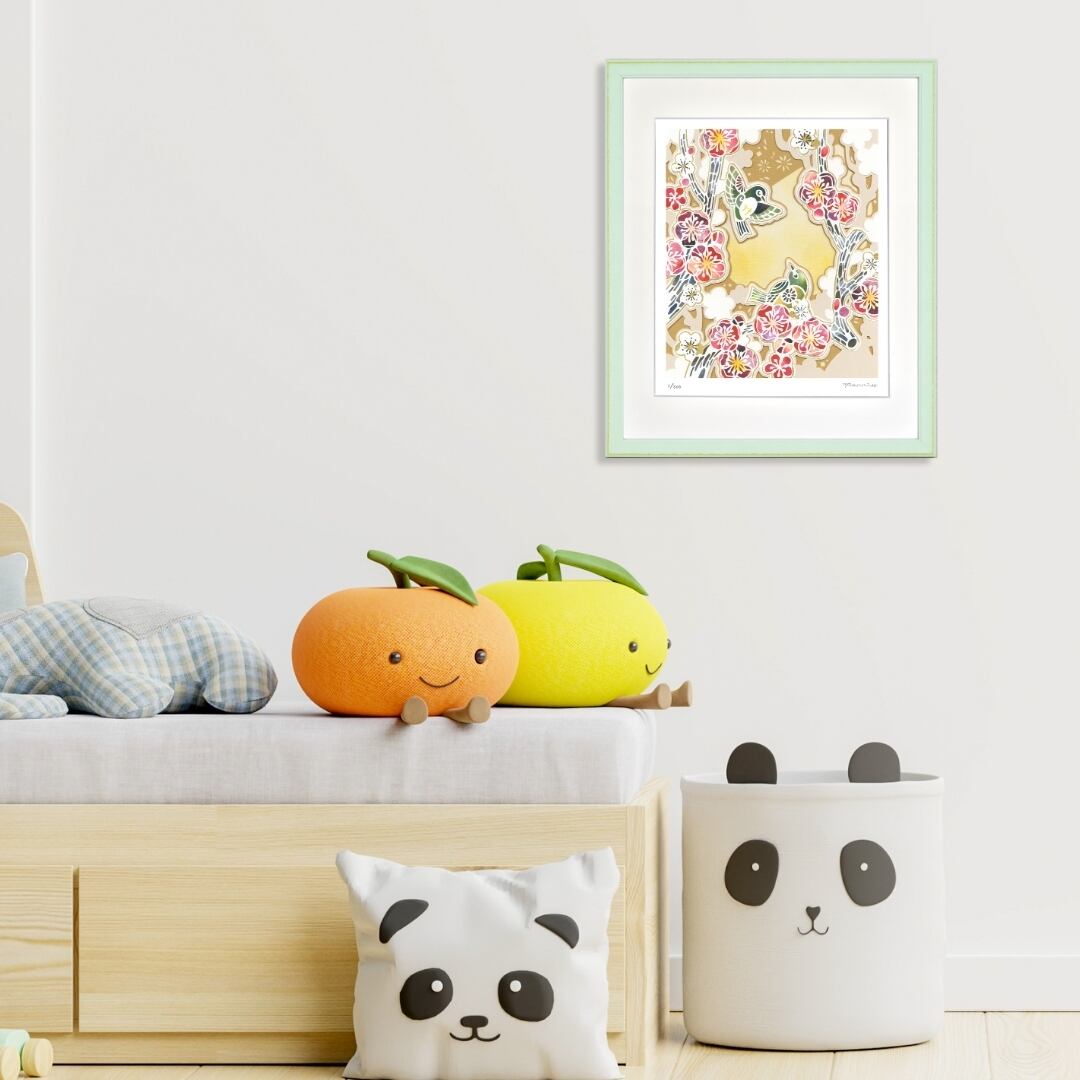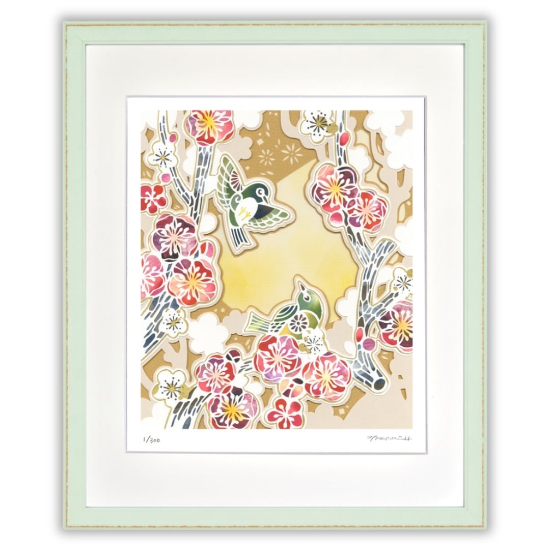 この作品は、春の訪れと自然の生命力を感じさせる瑞々しい美しさで、空間に季節感と心地よい明るさをもたらします。梅の花の赤や白のコントラストは華やかでありながら上品で、柔らかな月明かりが全体に落ち着きを与えるため、華麗さと静けさが絶妙に融合しています。メジロの姿は愛らしさを添え、日常の中に穏やかな春の喜びを呼び込んでくれるでしょう。四季の移ろいを彩る一枚として、心に安らぎと希望を与える作品となっています。